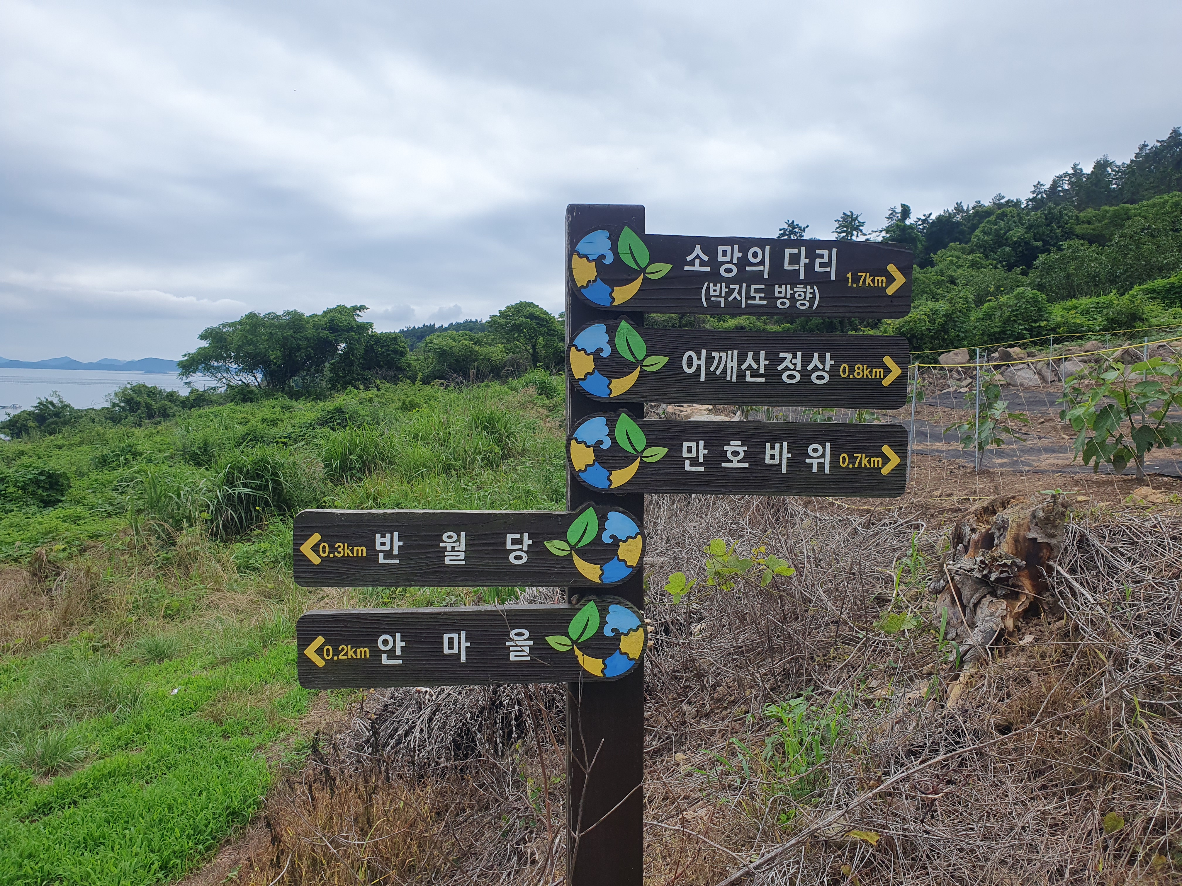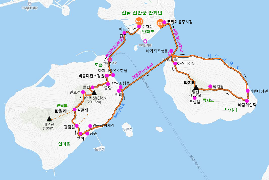 ♣ 코스: 퍼플교-박지도해변산책로-바람의언덕-당산-반달조형물-반월도해변산책로-당숲-어깨산-버들마편초정원-문브릿지-주차장