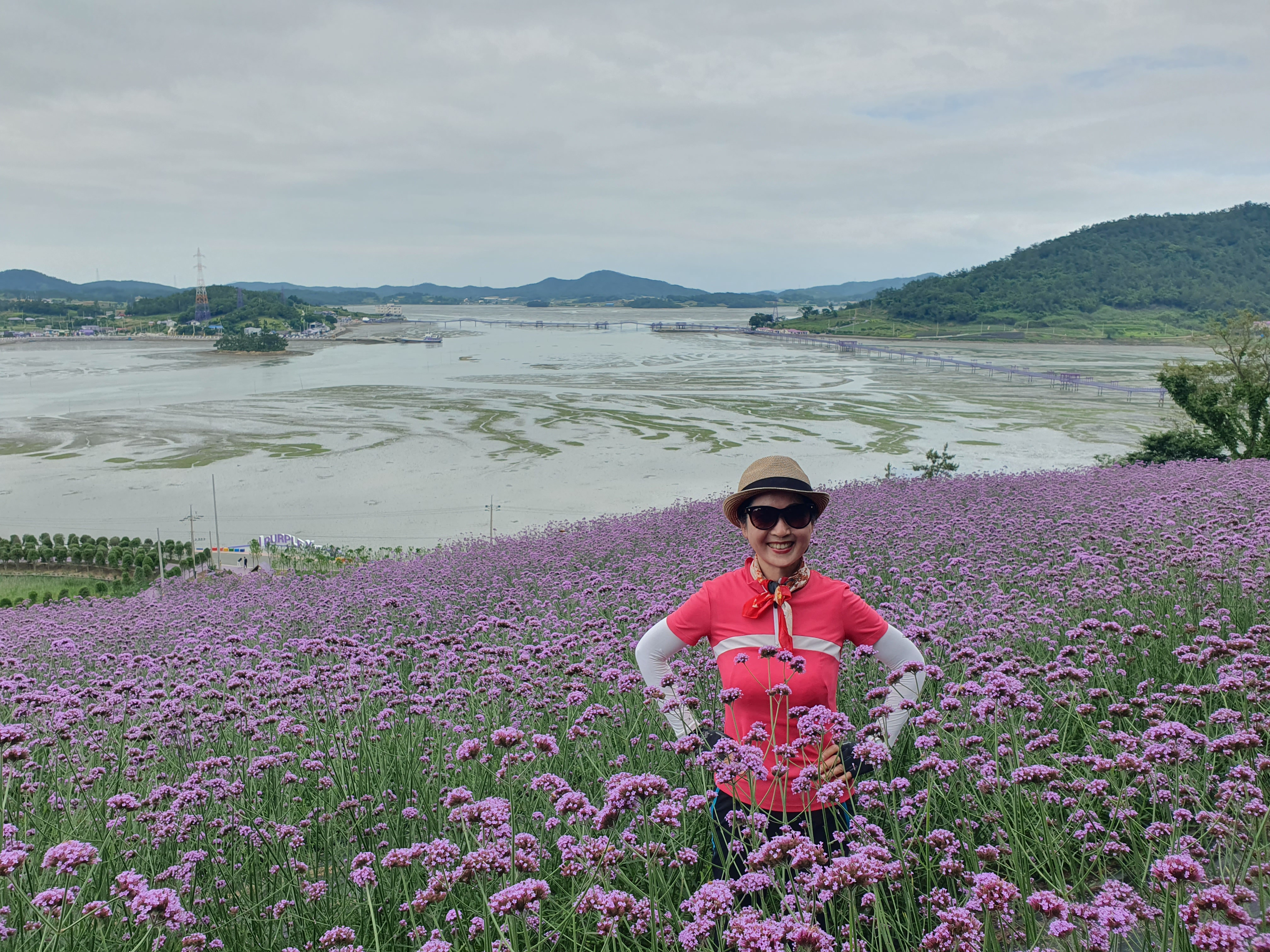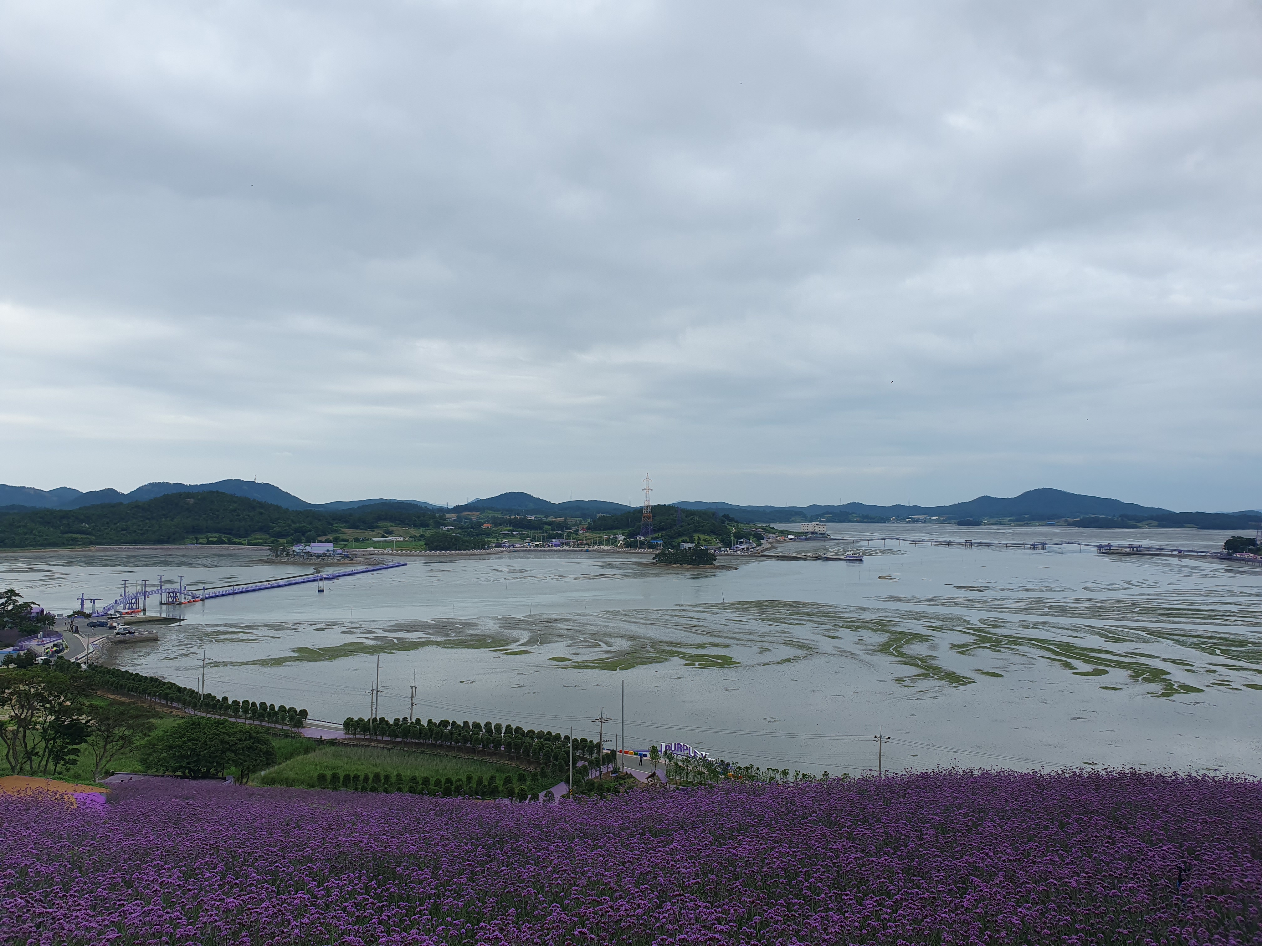 ▽ 최대 버들마편초 군락지인 공원에 도착, 주변을 조망해 보기로 하는데 왼쪽 멀리 문브릿지(부교)가 보인다. 만조였던 바다는 썰물이 되어 갯벌이 다 드러난 상태다.