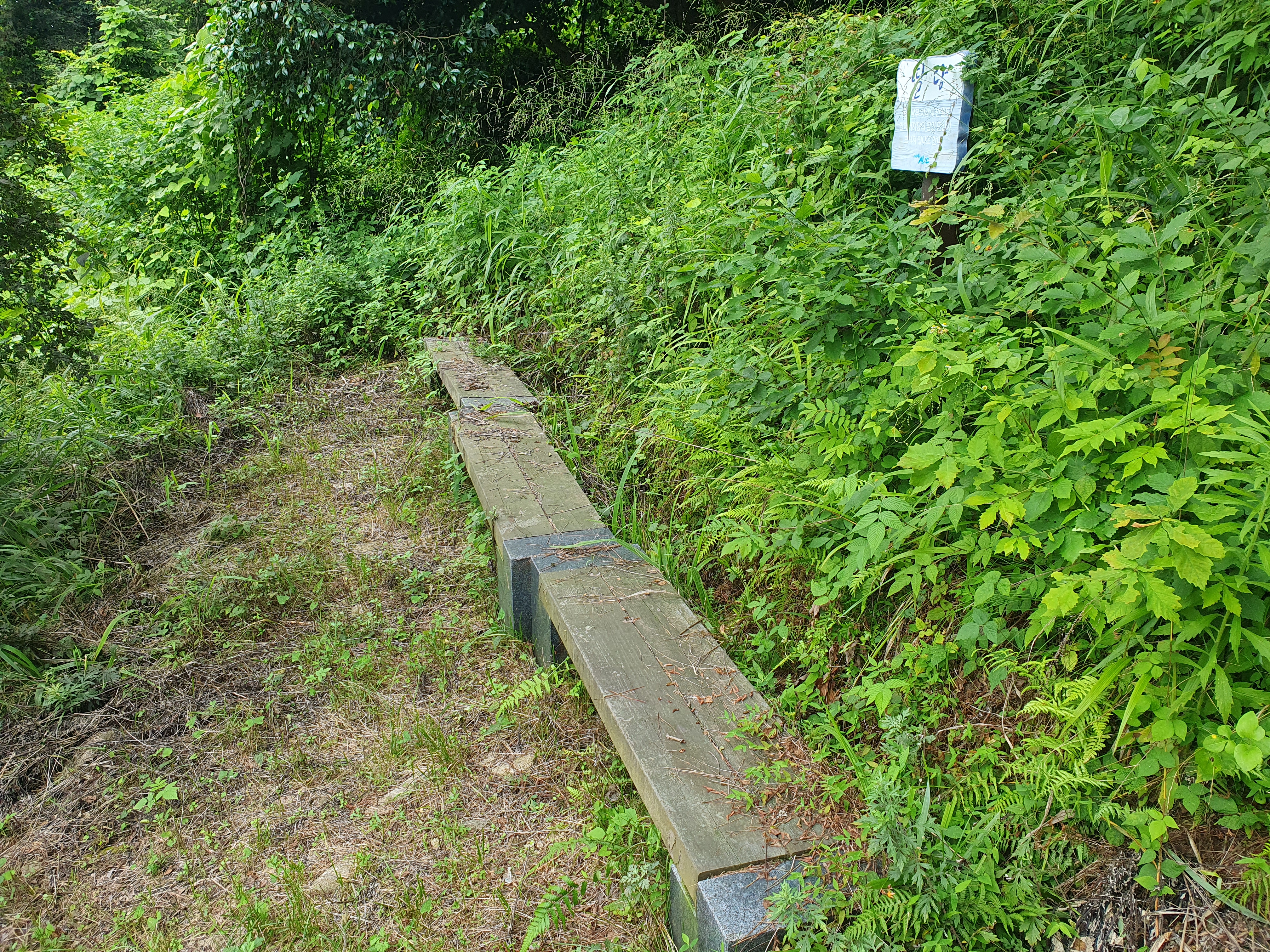 ▽ 시멘트 임도를 따라 무작정 오르다 보면 자칫 옛 집터 내지는 비석이 있는 곳으로 가게 된다. 반드시 이와같은 안내판을 보고 임도에서 벗어나 밭길로 이어지는 등로로 올라야 한다.