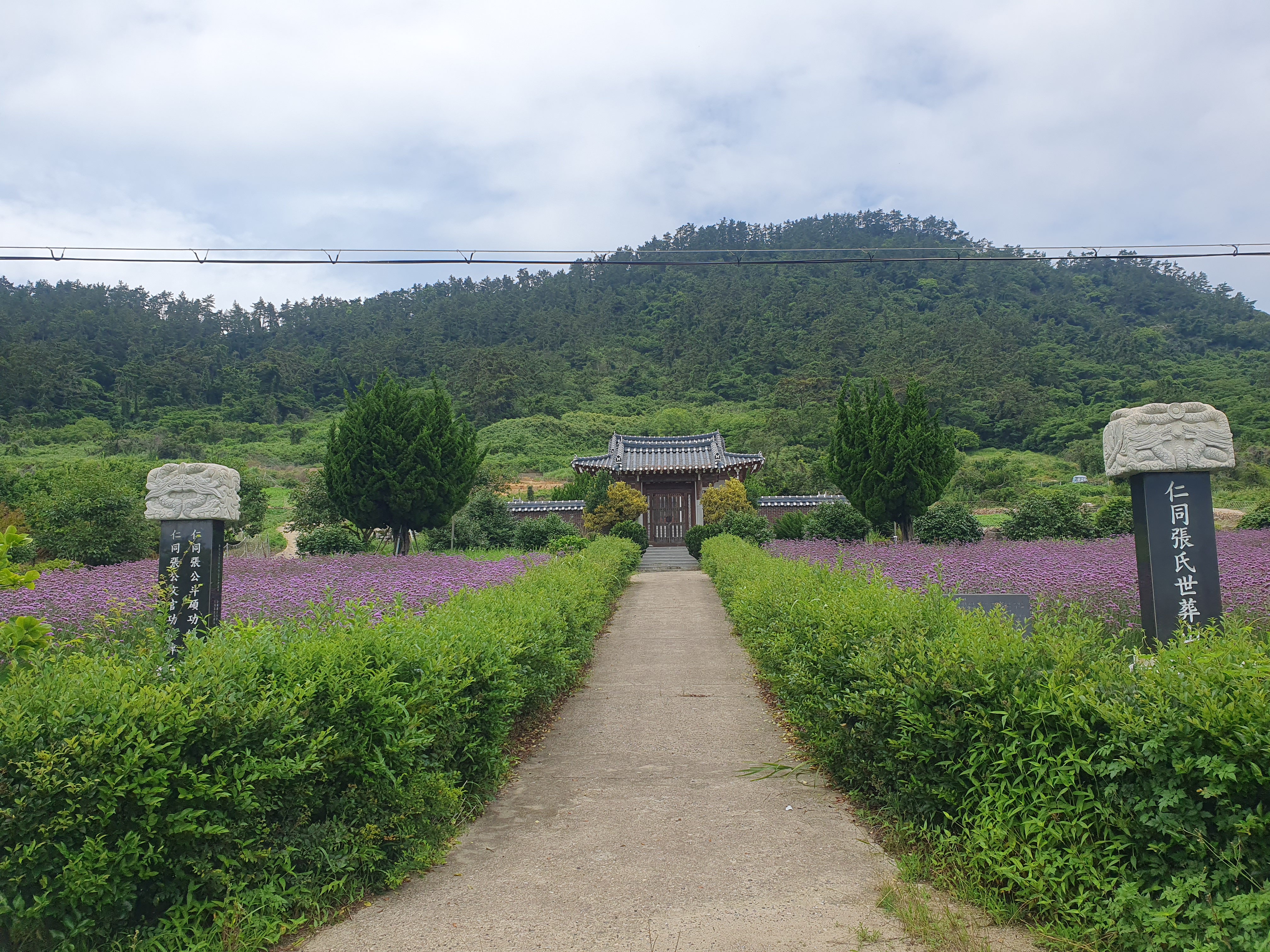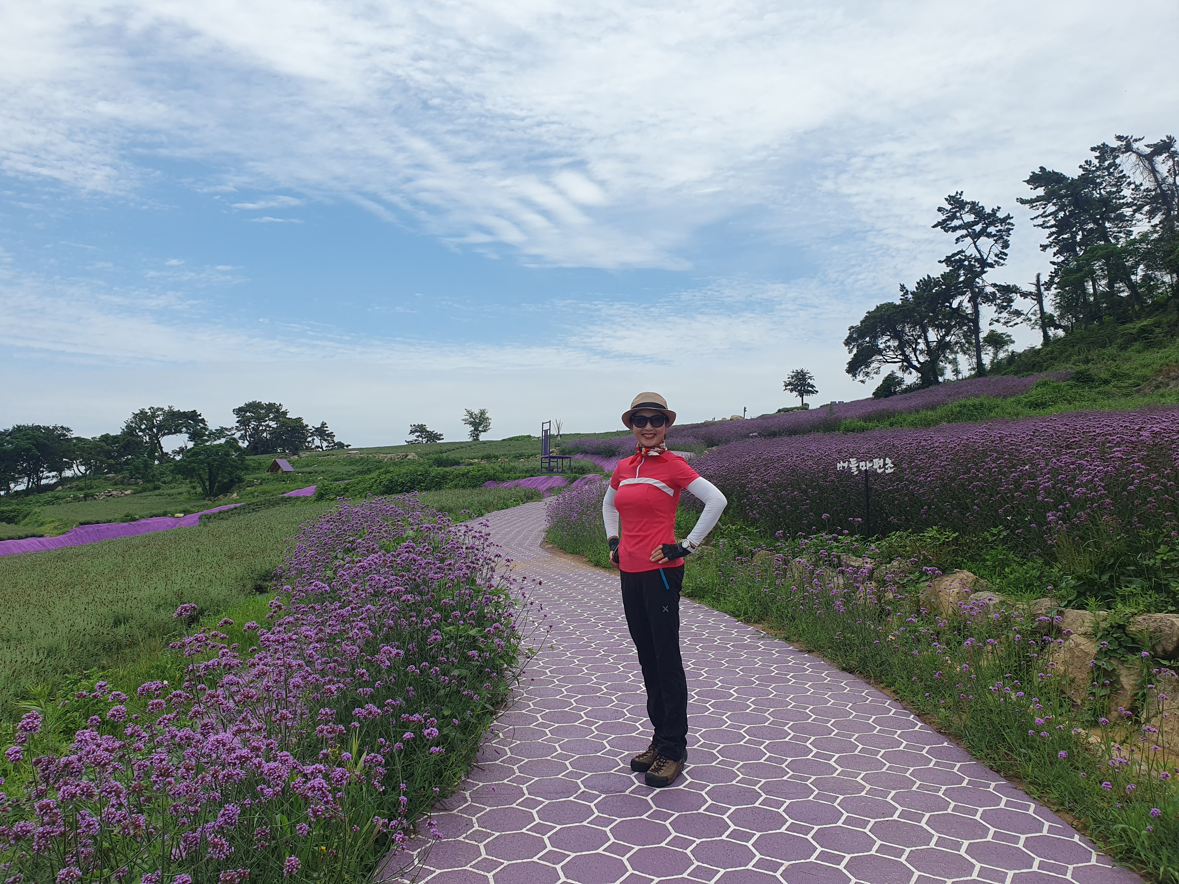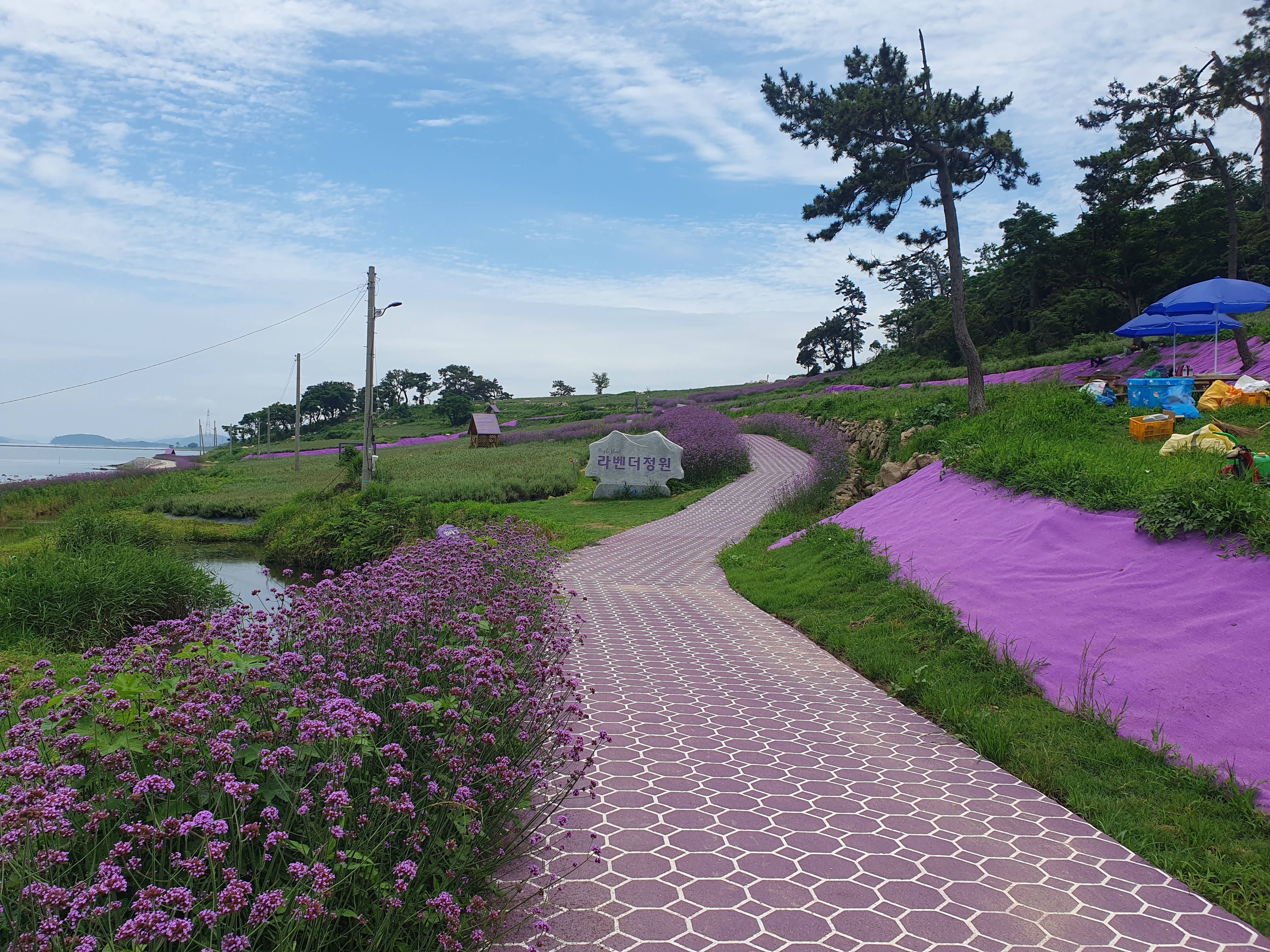 ▽ 라벤더정원은 보랏빛 분위기를 더하기 위해 주변에 보라색 천을 깔아 놨고 라벤더꽃은 지고 산책로 주변으로 버들마편초꽃이 그 자리를 대신했다.
