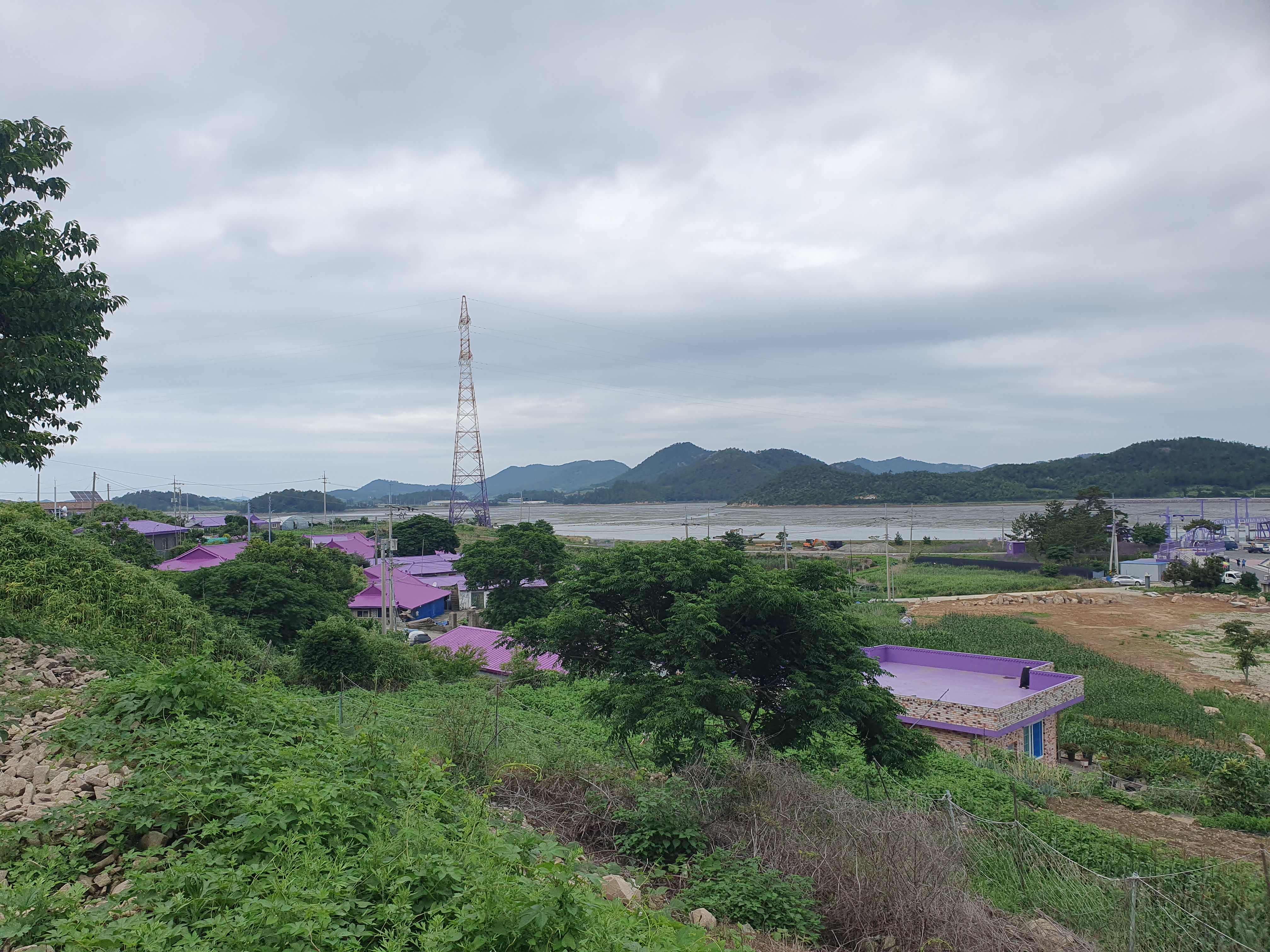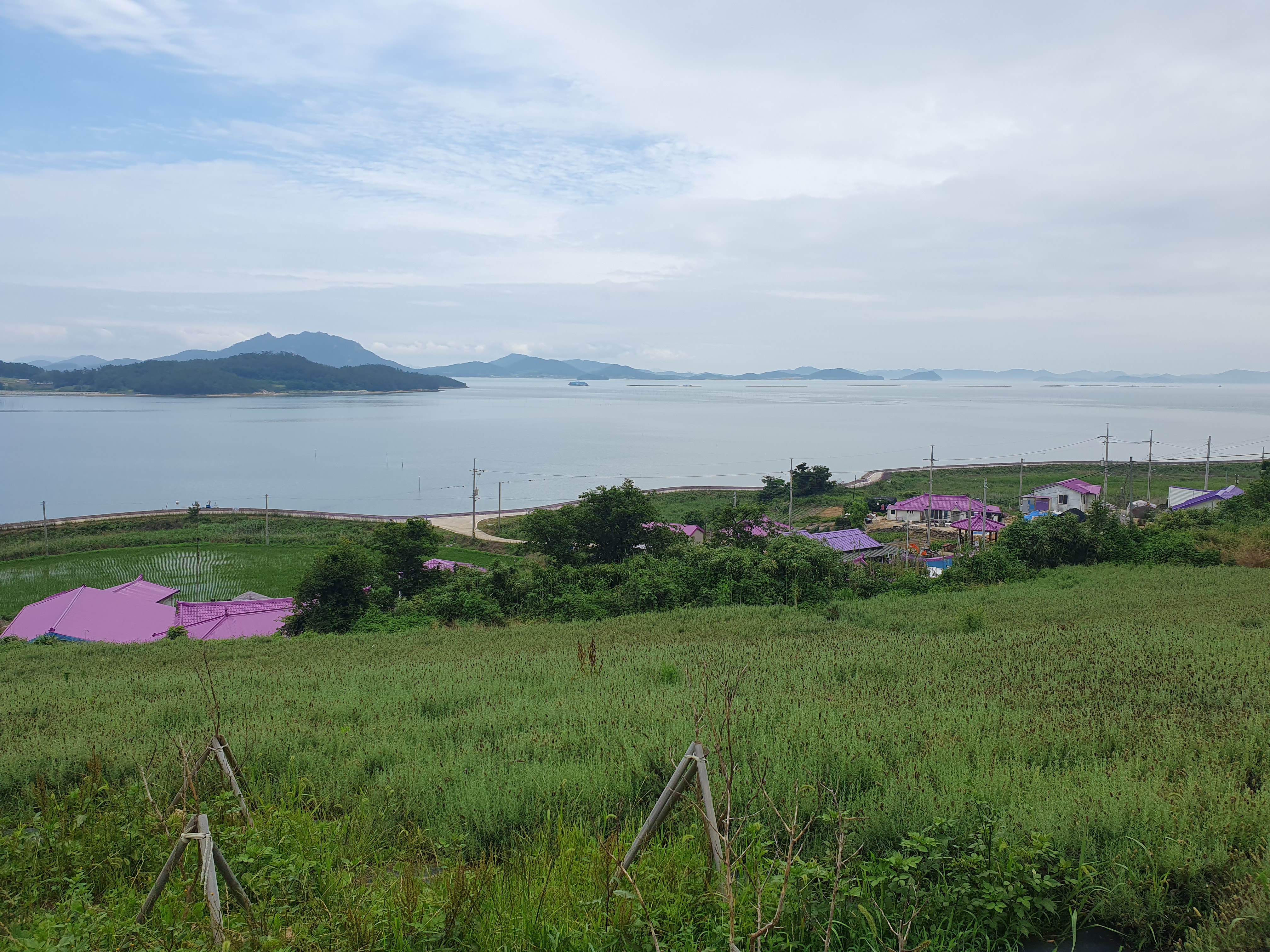 ▽ 안마을의 보랏빛 지붕을 보며 왼쪽 멀리 신안군 장산면의 장산도 오음산에 자꾸 눈길이 간다.
