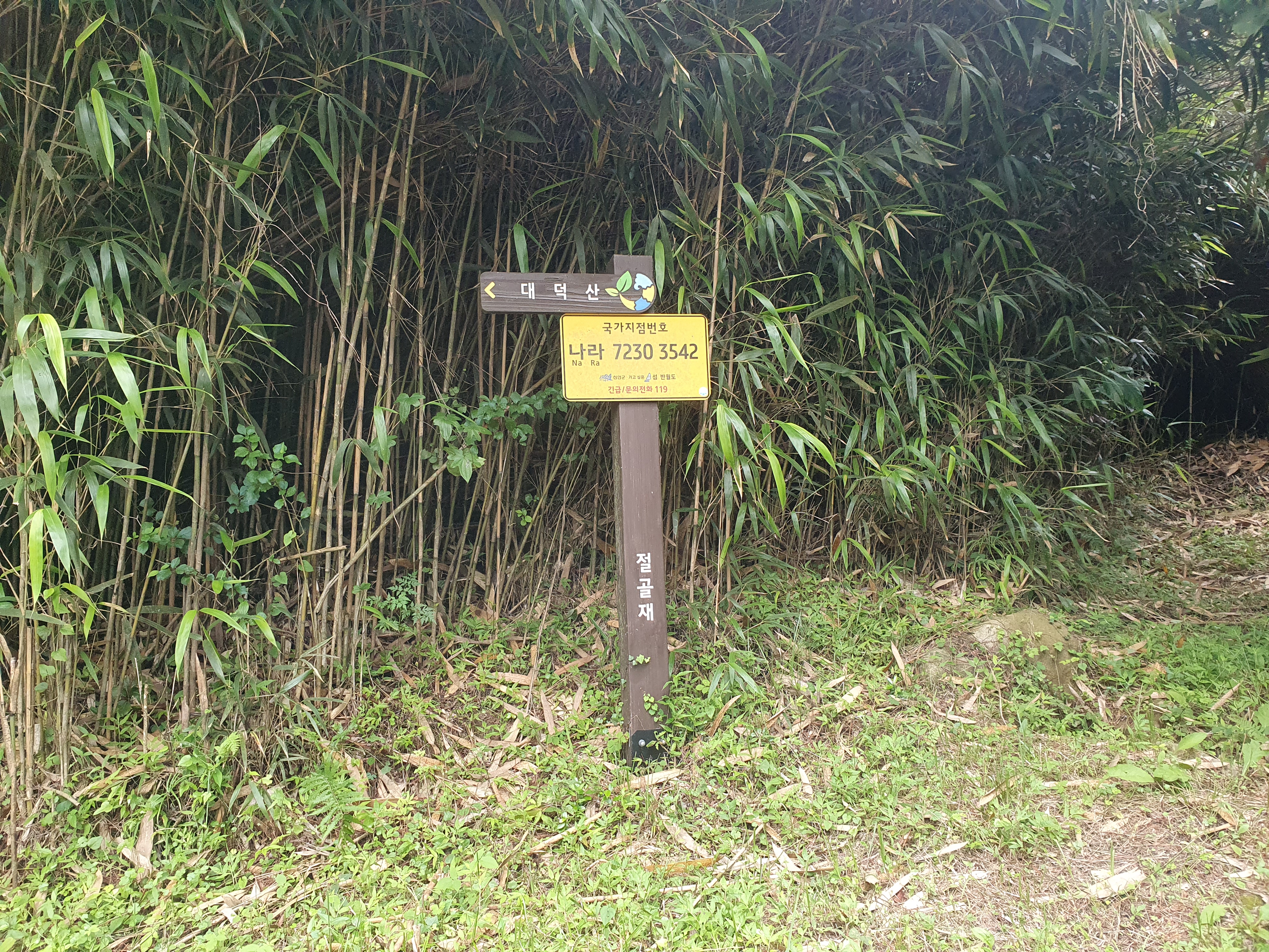 ▽ 신이대가 군락을 이룬 능선에 오르니 왼쪽으로는 대덕산, 오른쪽으로는 어깨산을 오르는 갈림길인 절골재가 나온다.