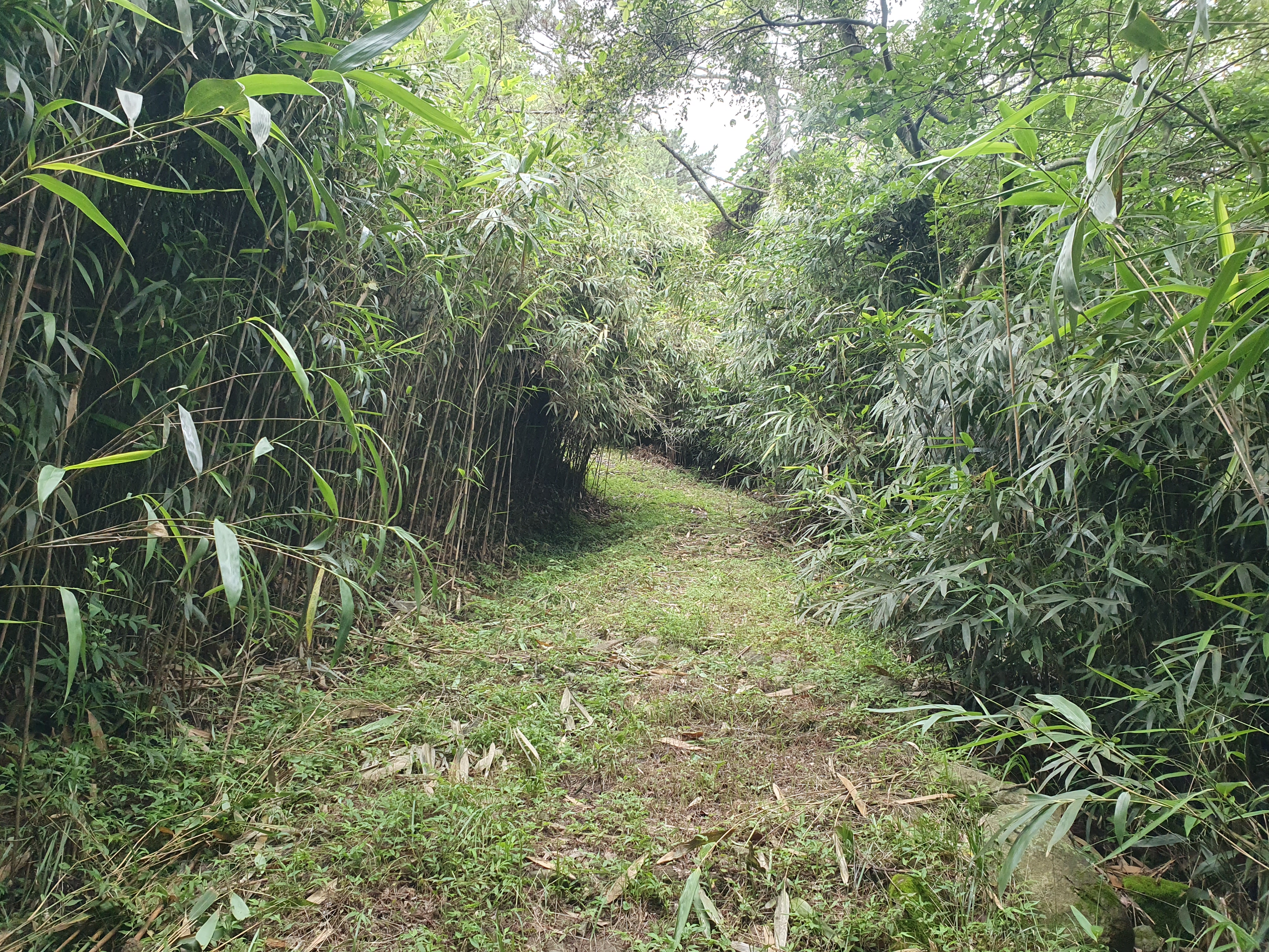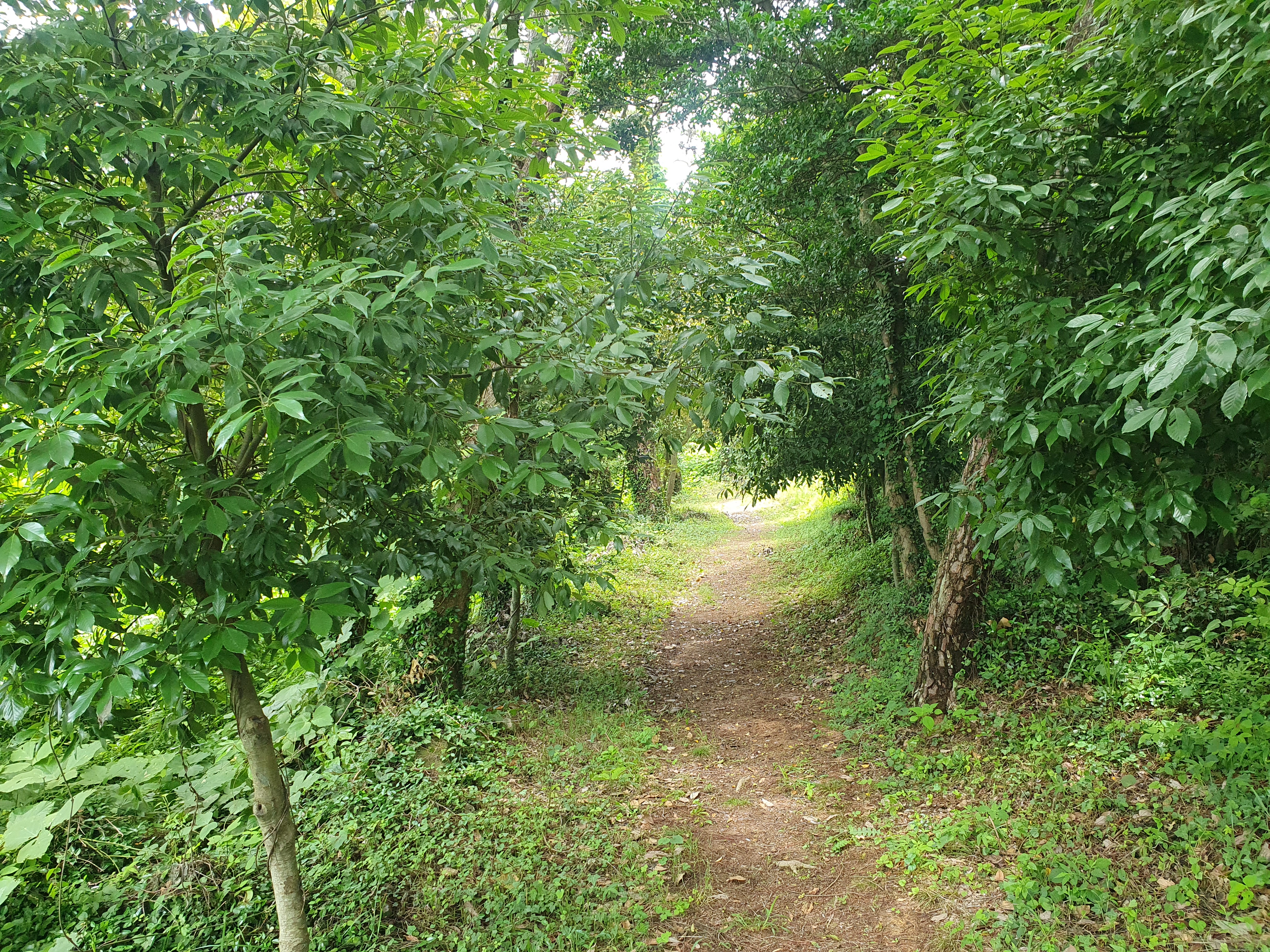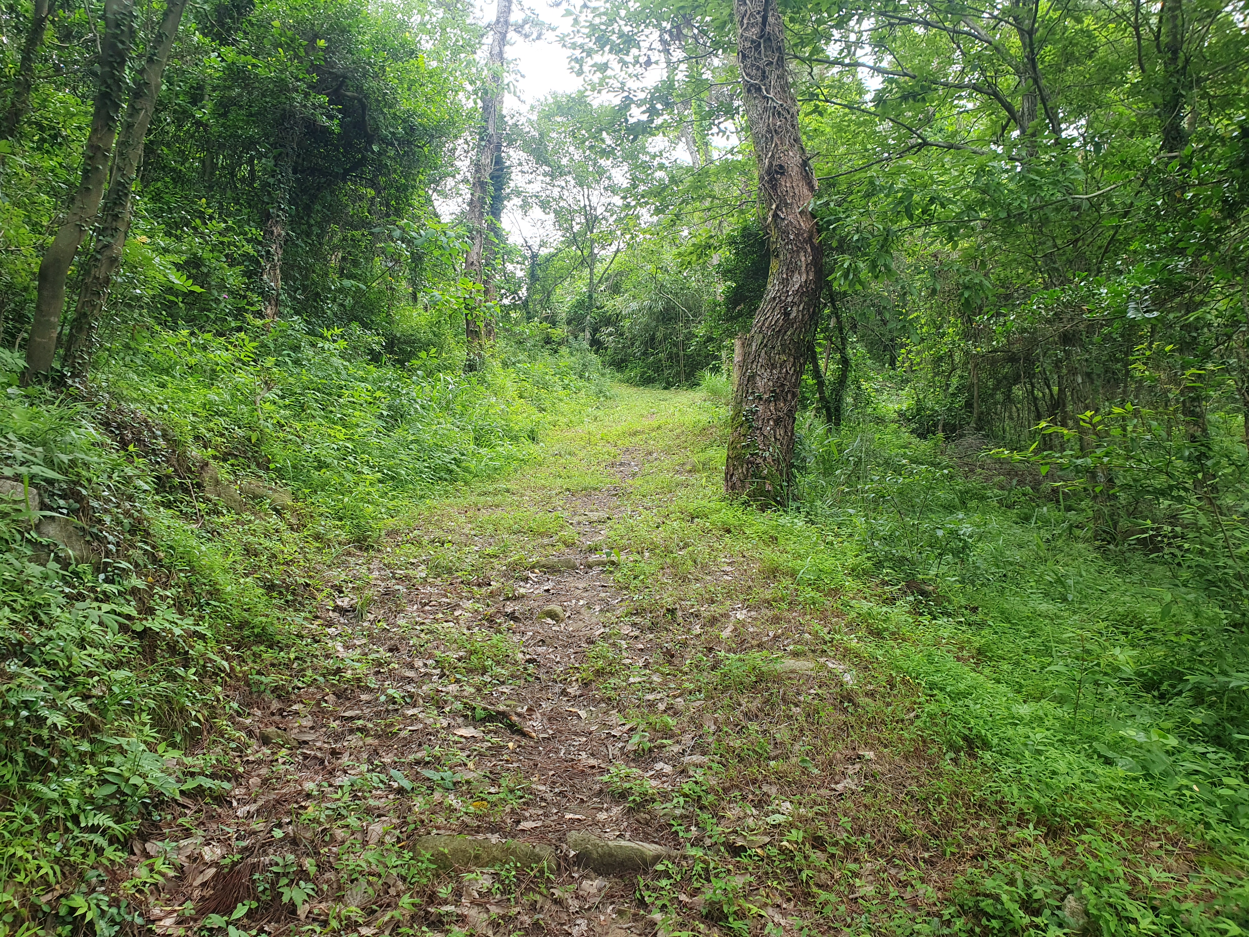 ▽ 본격적인 산행으로 이어진다. 좌우에 식재해 놓은 상록수들이 보기도 좋고 잘 정비해 놓아 걷기에 편하다. 그러나 숲길이라도 바람 한 점 없으니 해안길보다 더 덮다.