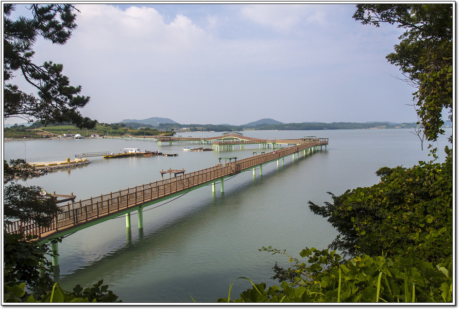 ▽ 두리마을로부터 박지도까지의 구간은 547m로 꽤 긴 거리이다. 6년전에 나무색깔 그대로도 좋았던 추억을 떠 올리며 화려하게 치장된 다리를 다시 한번 걷게 되니 감회가 새롭다.