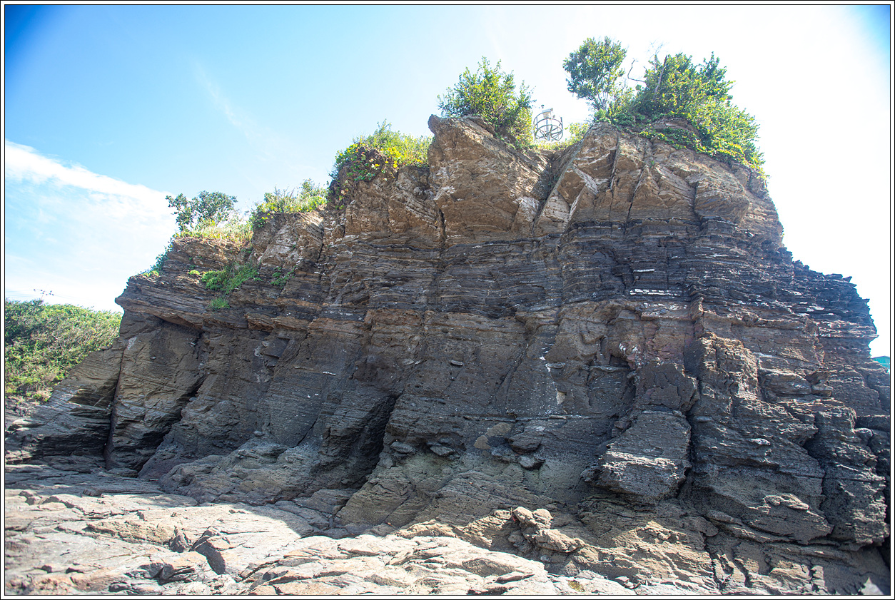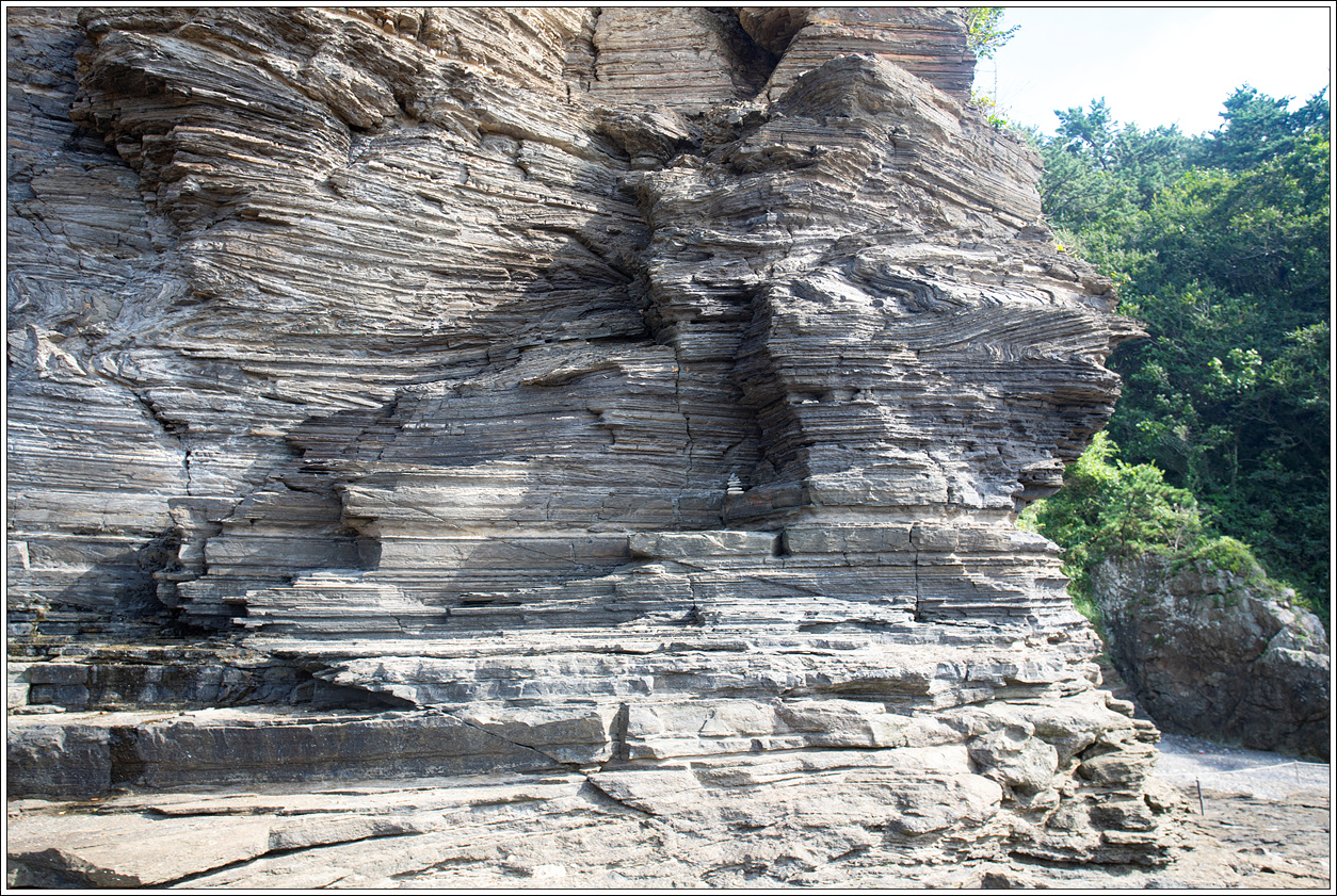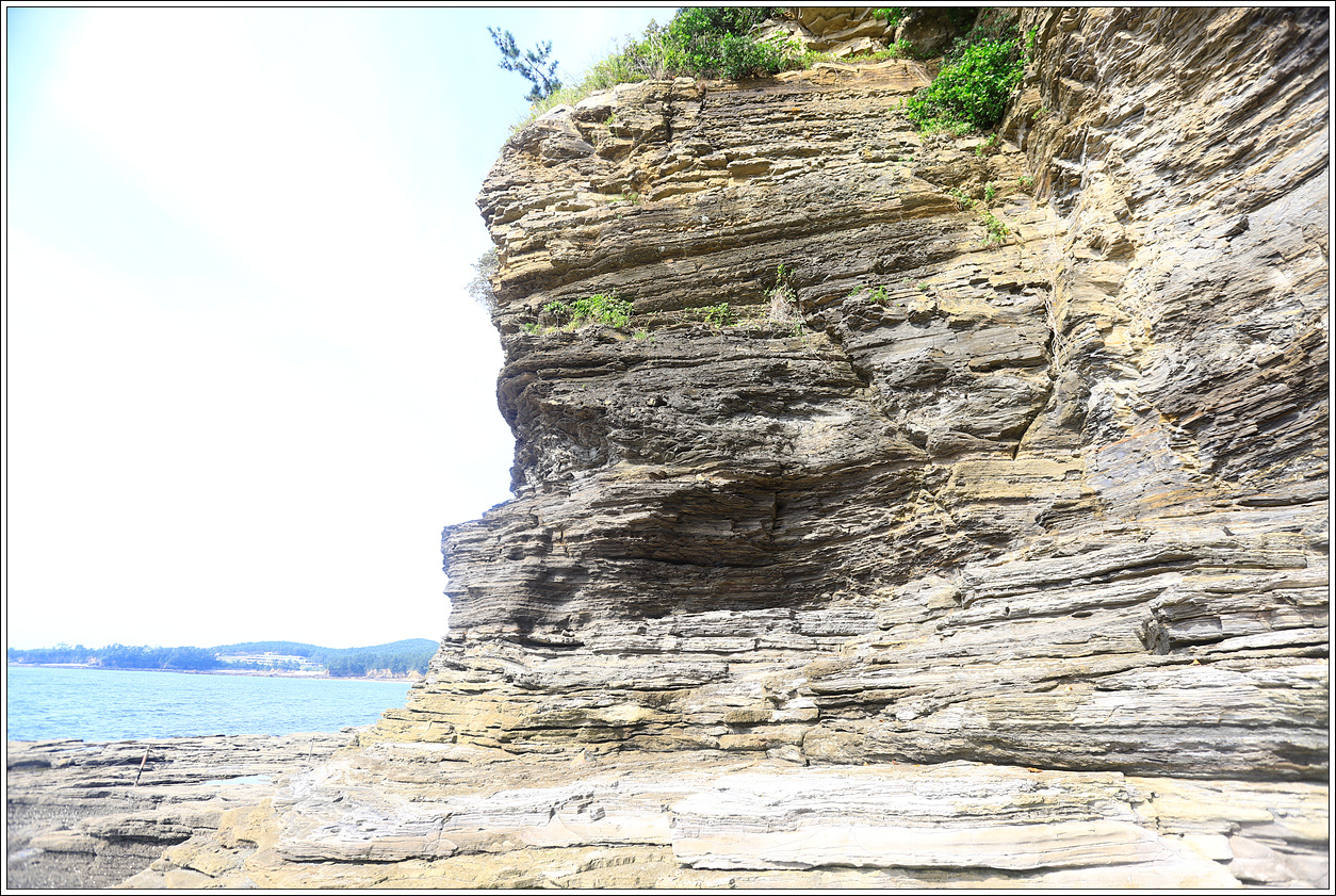 ▽ 바다에서 추켜올려진 단애는 수성암 단층이 여러 채색으로 조화를 이루고 있다. 바닷물의 침식을 받은 화산성 퇴적암층은 격포리층으로 역암 위에 역암과 사암, 사암과 이암의 교대층[호층, 互層], 셰일, 화산회로 이루어진 이암의 층서를 나타낸다. 퇴적환경은 화산 분출물이 깊은 호수 밑바닥에 고밀도 저탁류(底濁流, turbidity current)로 퇴적된 수중 삼각주로 해석된다.