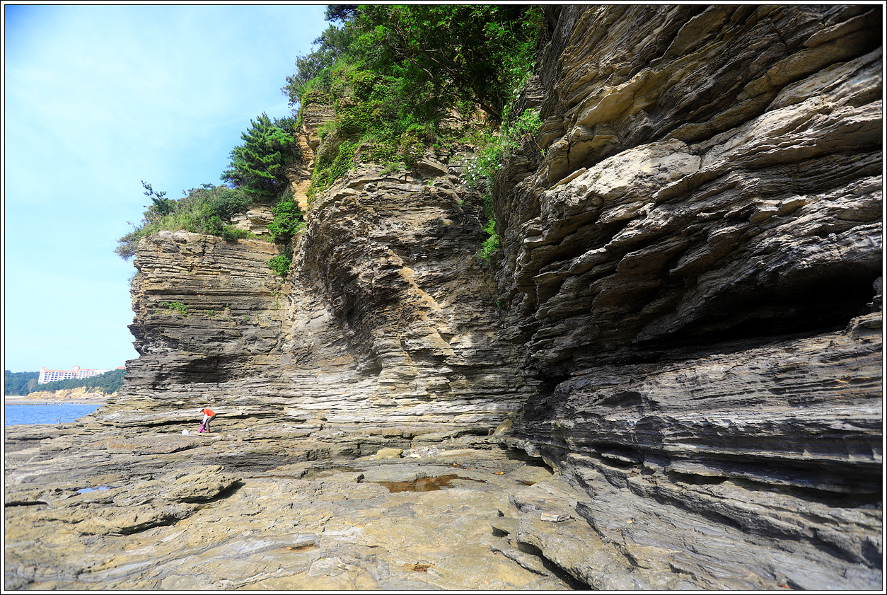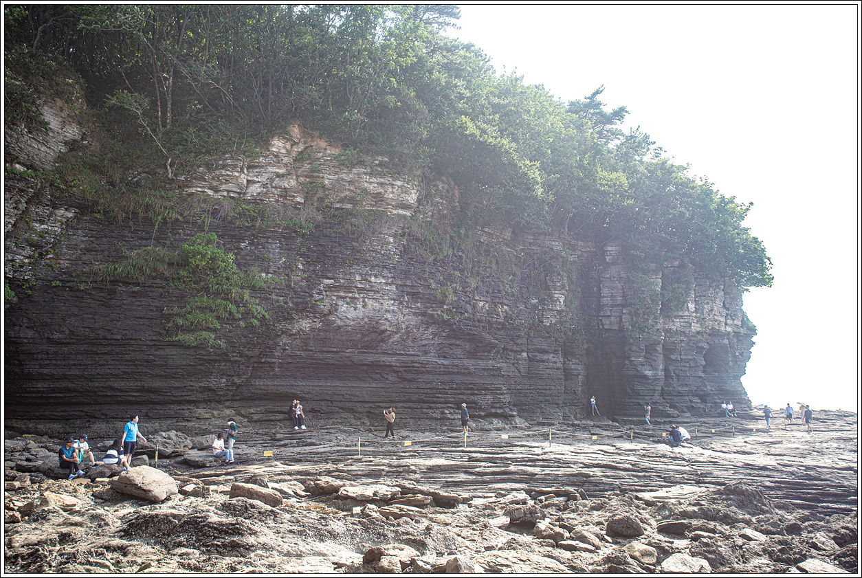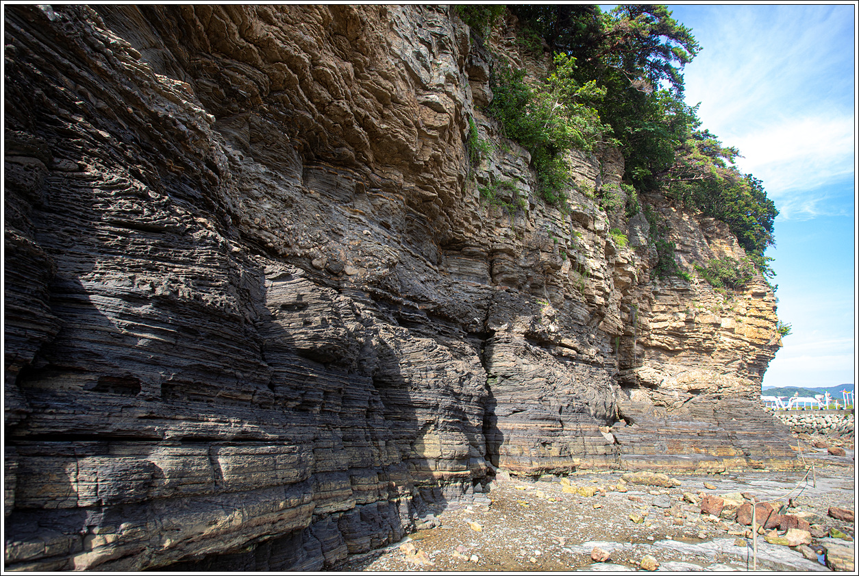 ▽ 바다에서 추켜올려진 단애는 수성암 단층이 여러 채색으로 조화를 이루고 있다. 바닷물의 침식을 받은 화산성 퇴적암층은 격포리층으로 역암 위에 역암과 사암, 사암과 이암의 교대층[호층, 互層], 셰일, 화산회로 이루어진 이암의 층서를 나타낸다. 퇴적환경은 화산 분출물이 깊은 호수 밑바닥에 고밀도 저탁류(底濁流, turbidity current)로 퇴적된 수중 삼각주로 해석된다.
