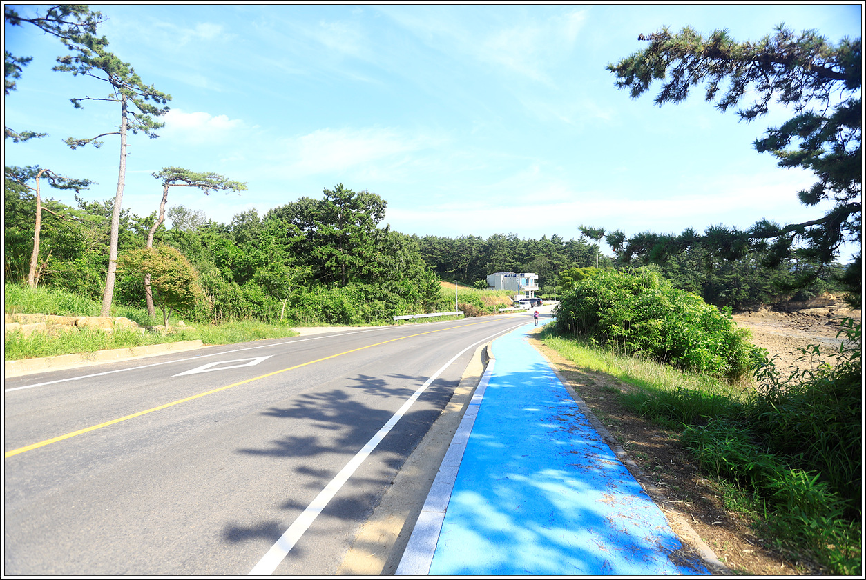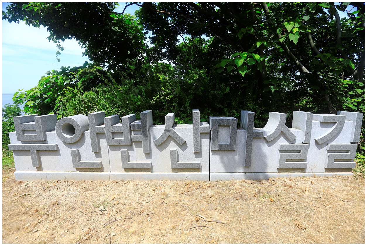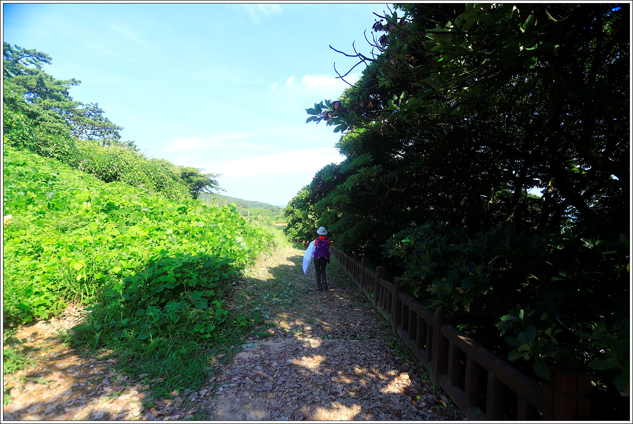 2코스인 노루목 상사화길을 걷고 이어서 3코스를 걷는다. 무더위에 양산을 쓰고 걸어도 뜨거운 햇살은 피할 수가 없다. 바닷바람이 간간히 불어오지만 더위를 식혀주기에는 역부족이다. 특히 출렁다리를 지나 반월안내소가 있는 도로의 시멘트길인 인도길을 걷는 구간은 발바닥도 아프고 곤혹이 아닐 수가 없다. 다 예상하고 온 일이지만 모처럼 동행한 아내에게 괜한 고생을 시키는 건 아닌가 미안한 생각이 든다. 일찍 도착하면 시원한 냉면이라도 시켜 먹어야겠다는 생각 뿐이다.