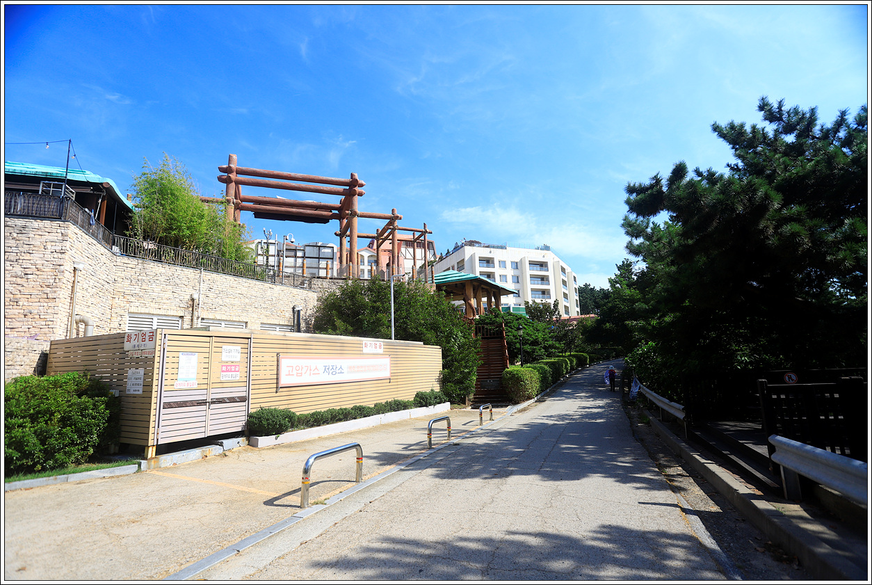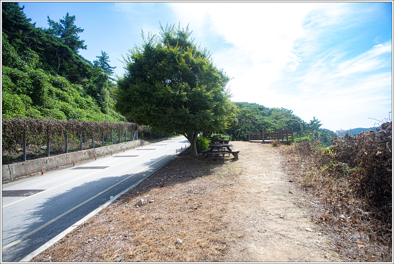 ▽ 자동차 도로 옆으로 이어진 길을 따라 걷다보면 쉴 수 있는 의자가 놓여있고 전망대가 있다.