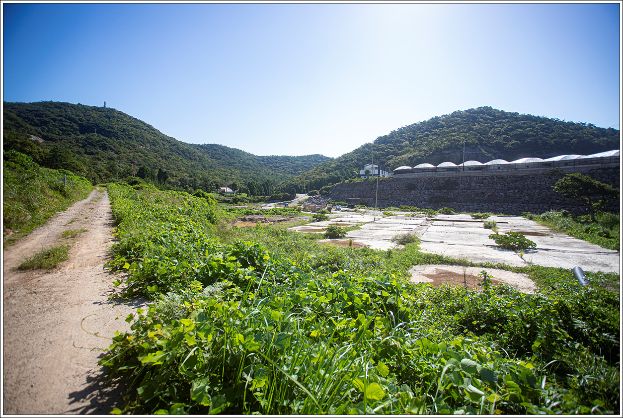 ▽ 이곳이 무슨 시설이 있었는지 개활지에다가 축대위에는 비닐하우스가 수개 동이 설치되어 있다. 이 도로를 따라 300여 미터 지점에 버스 주차장이 있다.