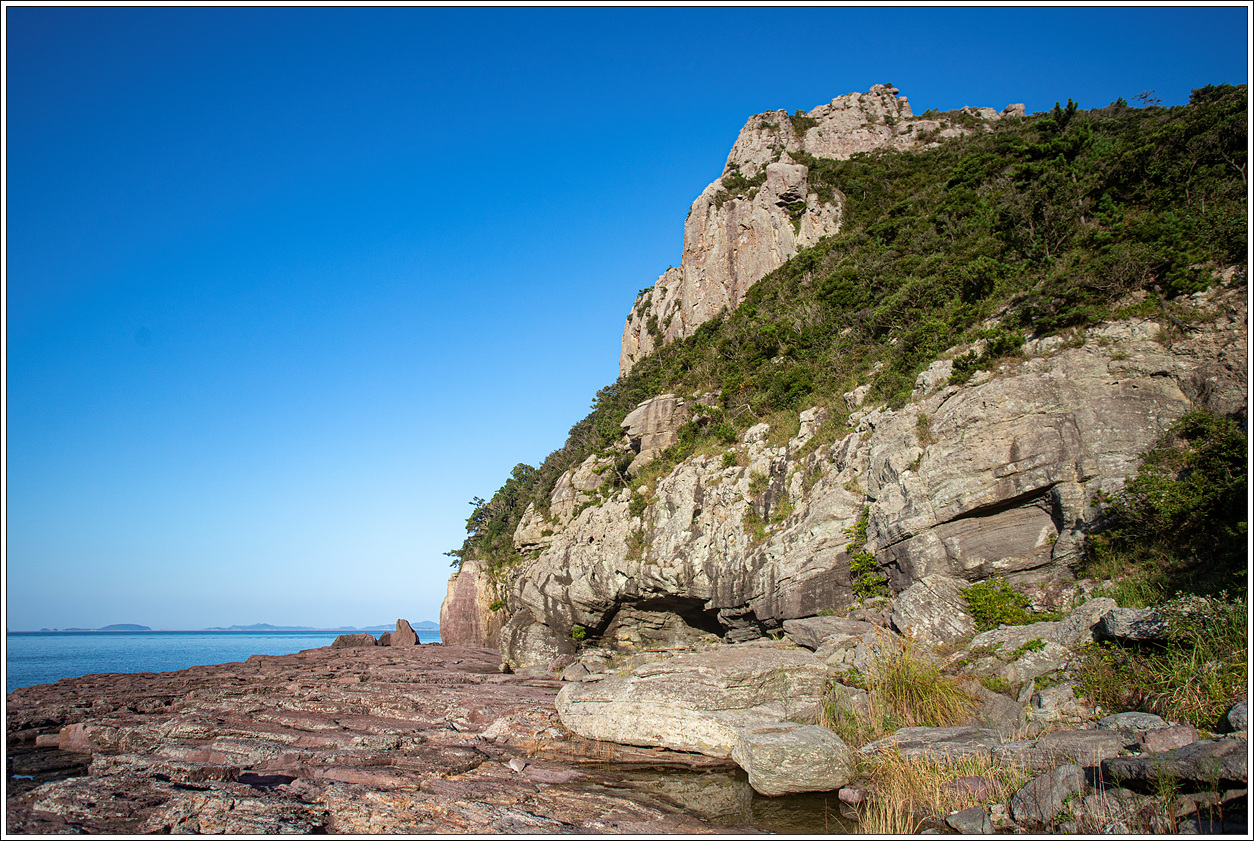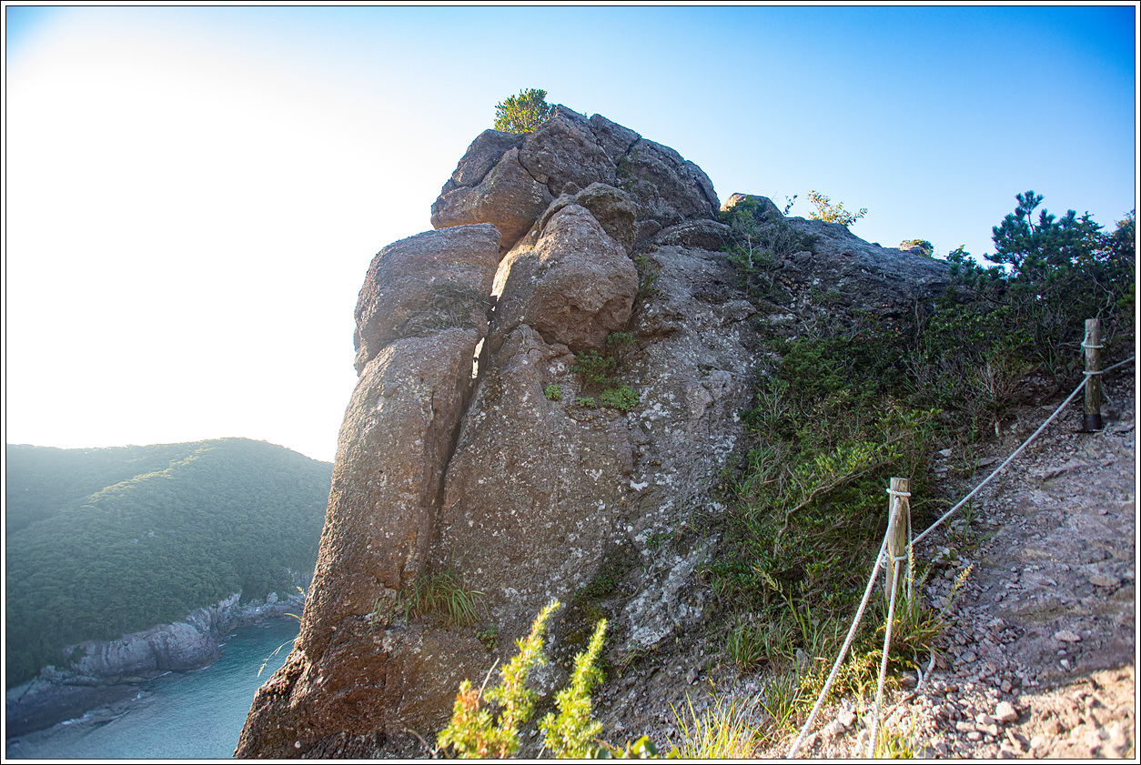 ▽ 당겨 본 솔섬바위가 있는 암봉 및 해식 단애가 있는 해안 풍경...