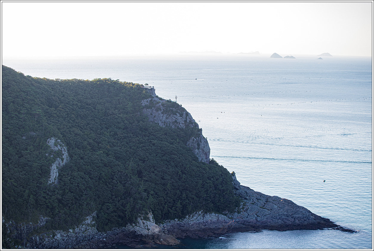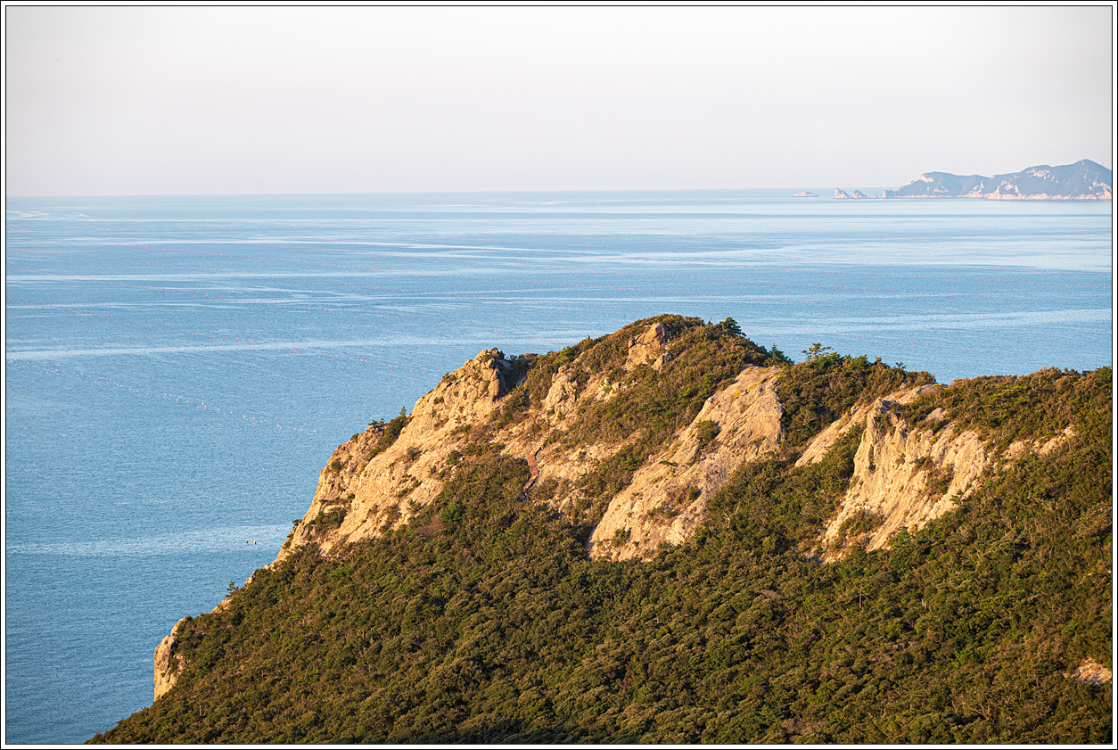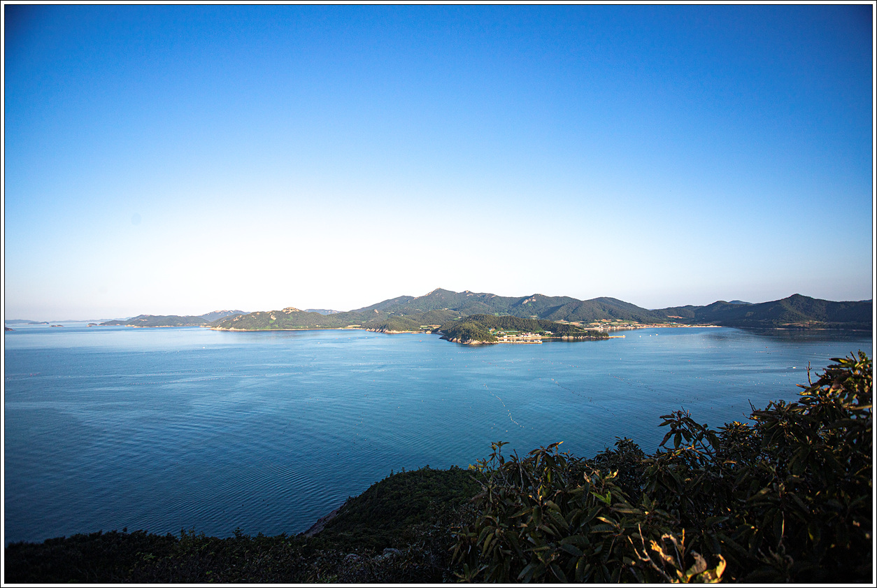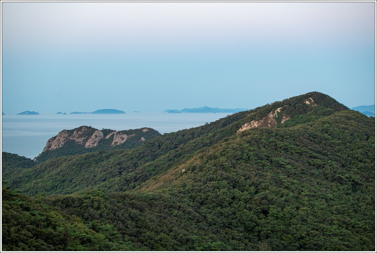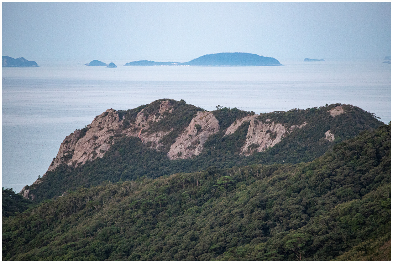 ▽ 멀리 오른쪽으로 약 35km 거리에 블야선정 100섬에 포함되는 보길도의 격자봉이 보이고 그 앞으로 희미하게 넙도가 보인다.