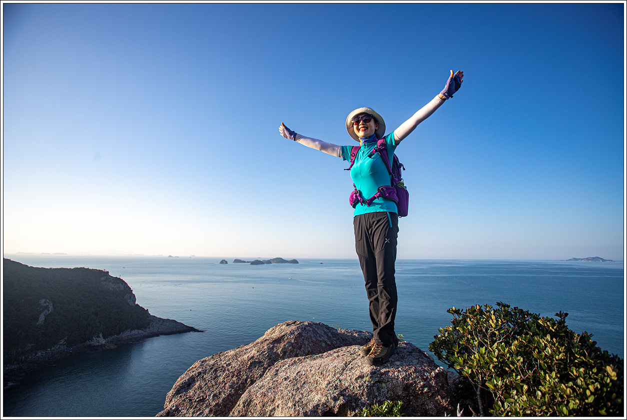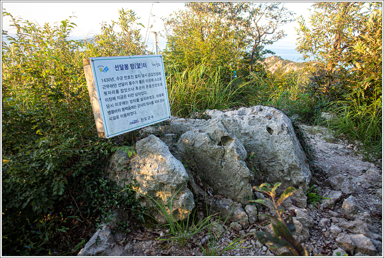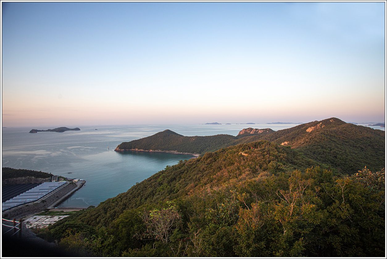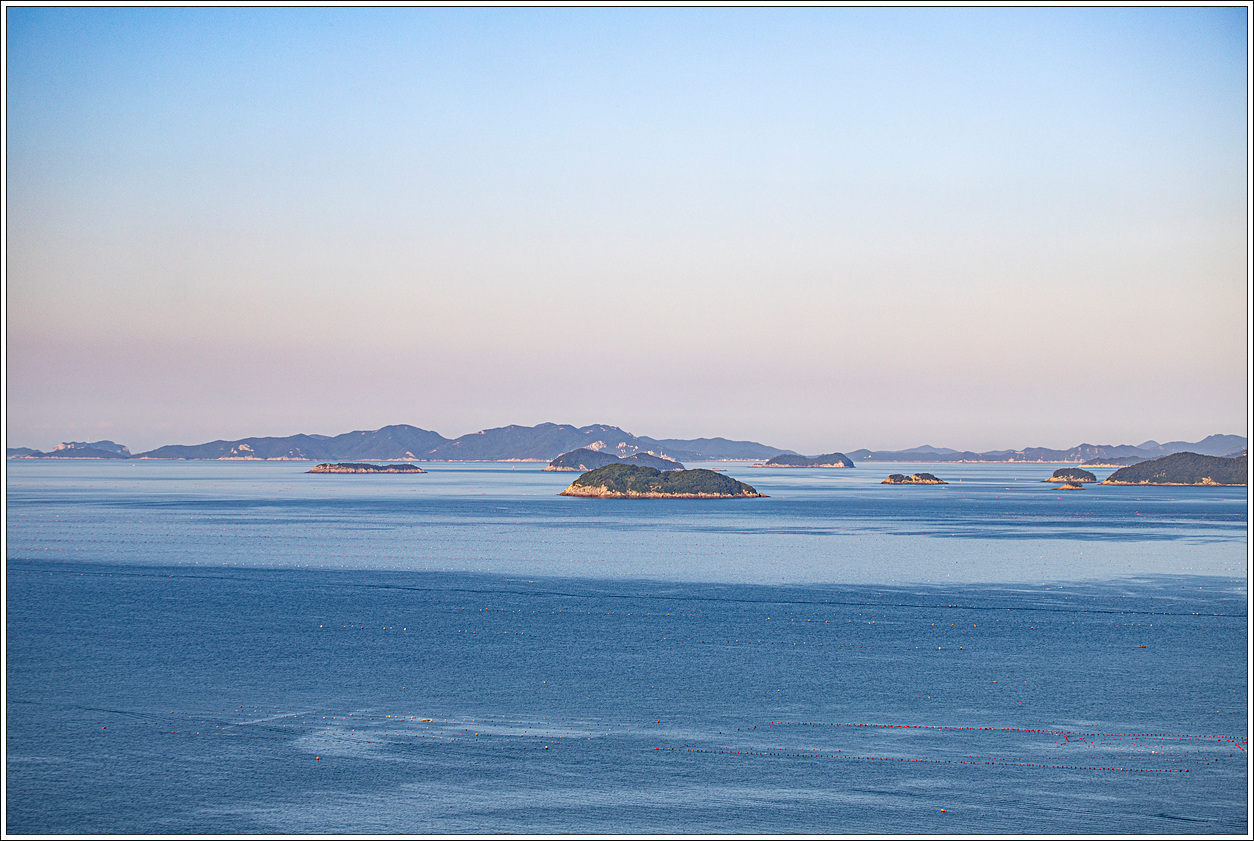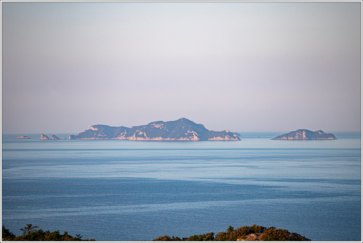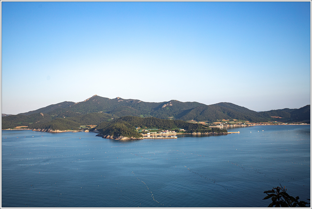 ▽ 멀리 오른쪽으로 약 35km 거리에 블야선정 100섬에 포함되는 보길도의 격자봉이 보이고 그 앞으로 희미하게 넙도가 보인다.