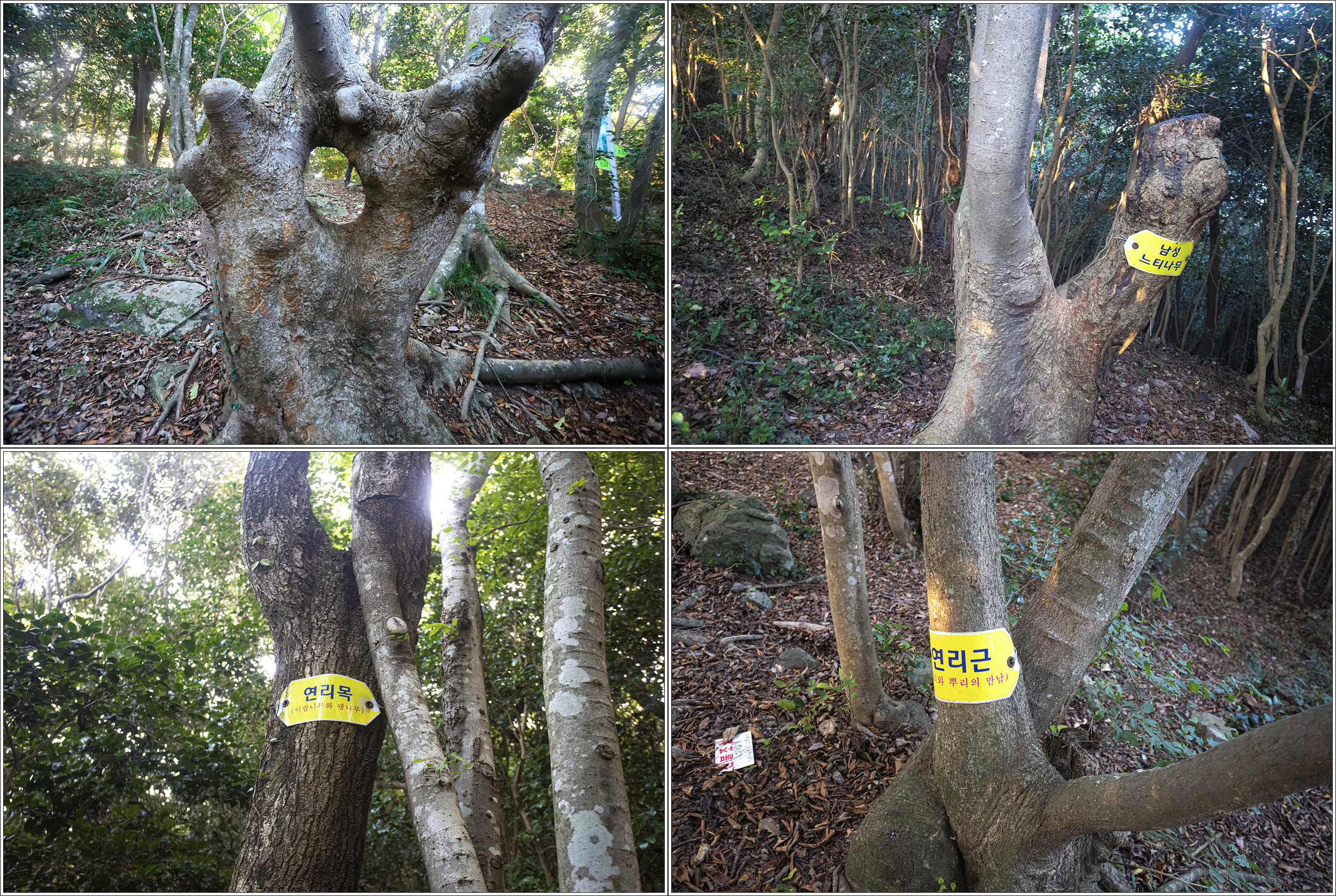 ▽ 구실잣밤나무의 줄기가 12개로 뻗었는데 흥미롭게 12지간(支干)을 본따서 12지목(支木)으로 나눠 이름을 붙여 놓아 눈길을 끌게 한다.