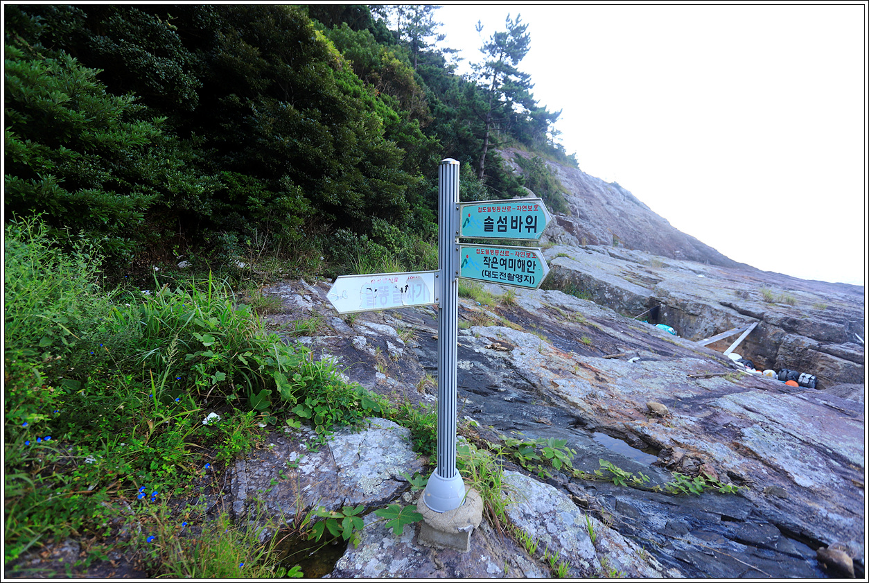 ▽ 왼쪽으로 가면 짧은 코스로 말똥바위와 전망대가 나오고, 오른쪽으로 가야 솔섬바위를 거쳐 솔담해안의 절경을 볼 수가 있다.
