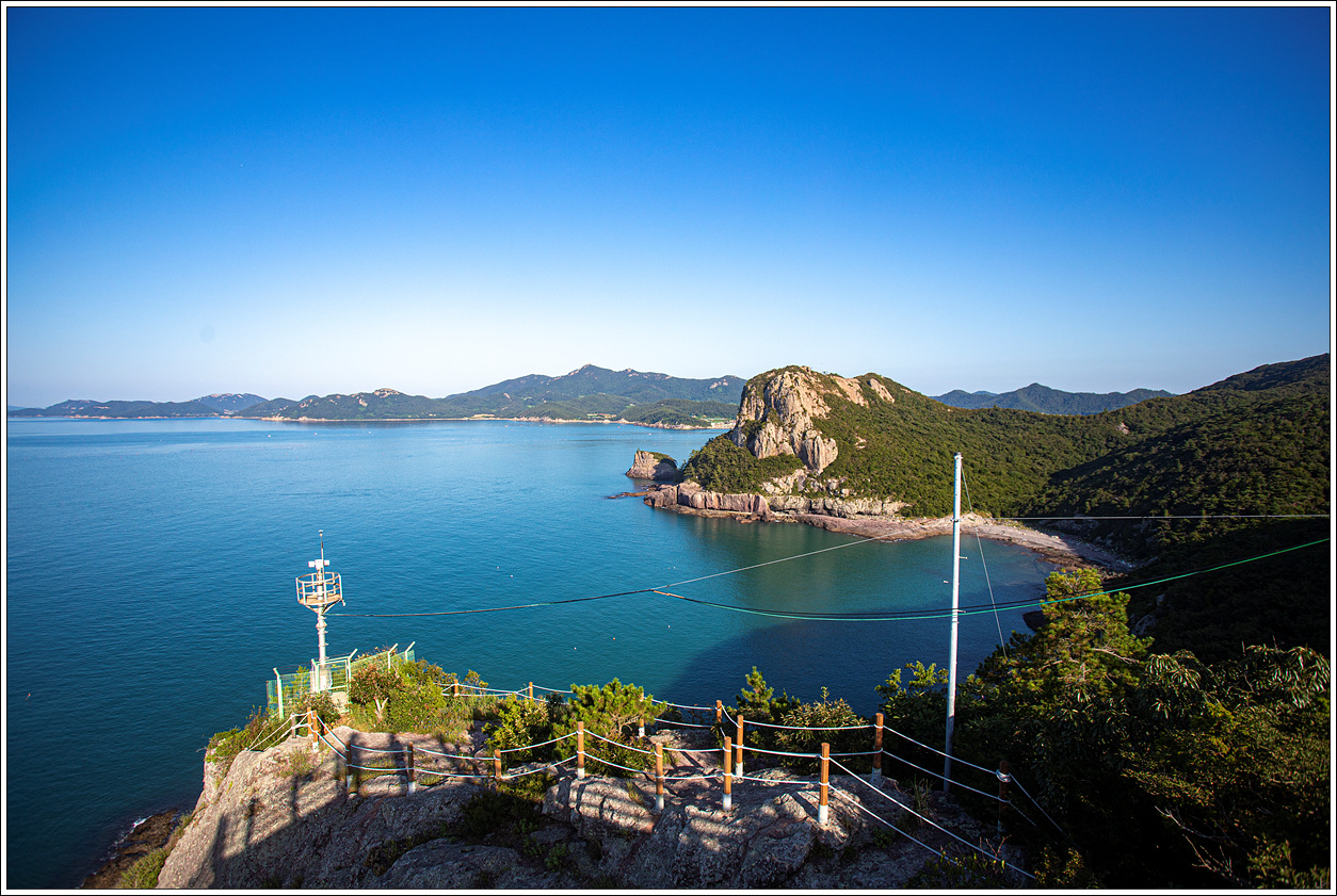 ▽ 독거도 오른쪽인 남서 방향으로 왼쪽 죽항도 뒤로 관매도의 돈대산이 뾰족하게 보이고 가운데 암봉으로 뭉툭하게 보이는 각흘도, 오른쪽으로 길게 역시 블야선정 100섬에 포함되는 하조도이고 하얗게 암릉이 보이는 부분이 1909년부터 운용되어 온 역사 깊은 하조도대 등대가 있는 위치이고 그 앞으로 왼쪽부터 불무도, 앞쪽으로 죽도, 그 뒤로 사자도 등 다도해국립공원에 해당된다.