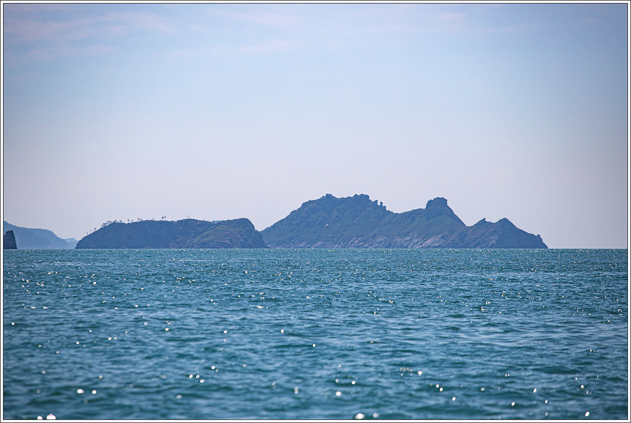 ▽ 대소동도 뒷편으로 당겨 보니 성남도와 소성남도가 겹쳐 보이는 모습이고, 그 뒤로 하조도의 손가락바위도 보인다.