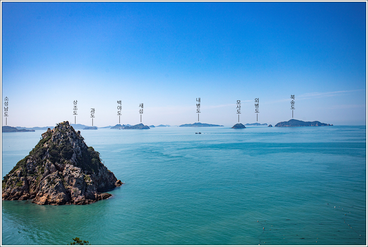 ▽ 서쪽으로 해안경관산책로가 보이고 왼쪽부터 북송도, 거북섬인 마도, 오른쪽으로 가덕도, 접우도, 외공도가 한 눈에 들어온다.