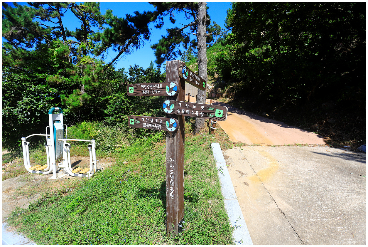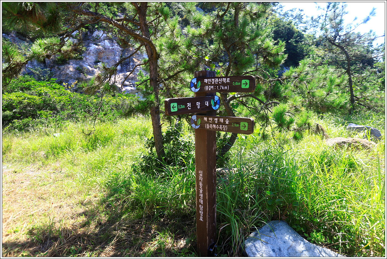 ▽ 다시 갈림길로 내려와서 왼쪽으로 가면 해안생태숲과 해안경관산책로로 식당이 있는 돌목마을로 십자동굴을 보고 왔던 길로 가지않고, 한바퀴 돌아보는 이 길로 갈까 망설였는데 결국 별로 볼거리가 없을 것 같아 조금 짧은 거리인 차를 타고 왔던 길로 되돌아 가기로 한다. 배도 고프고 땡볕에 의지가 꺾이고 만 것이다.