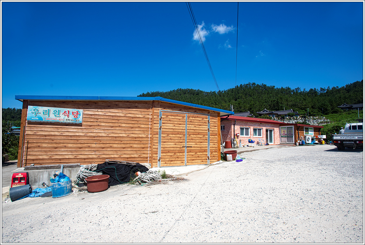 ▽ 빨간 지붕의 유일한 식당에 도착했다. 아침식사도 제대로 못하고 접도를 트레킹하고 이곳에서 또 걸었으니 밥 생각 뿐이 없다. 일단 실외에 있는 수도에서 등목을 하고 환복한 다음 식사를 한다.
