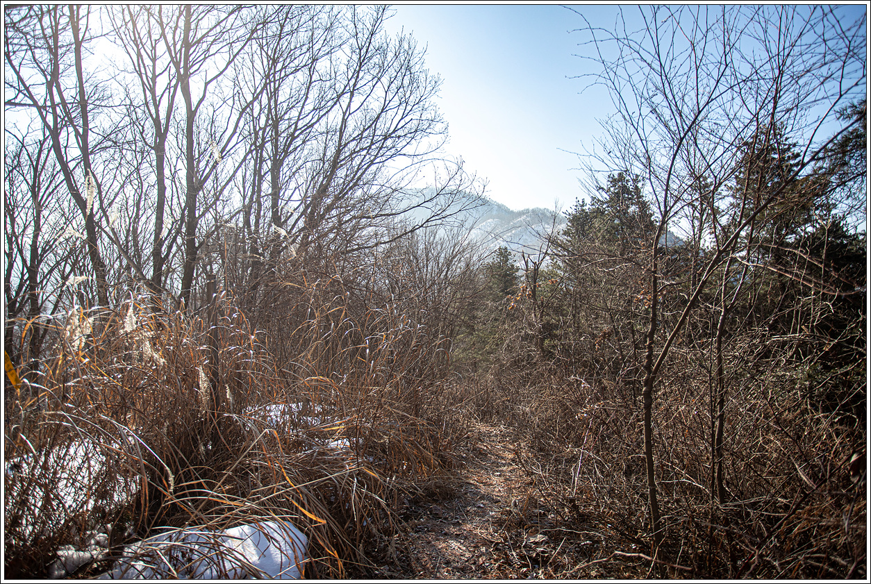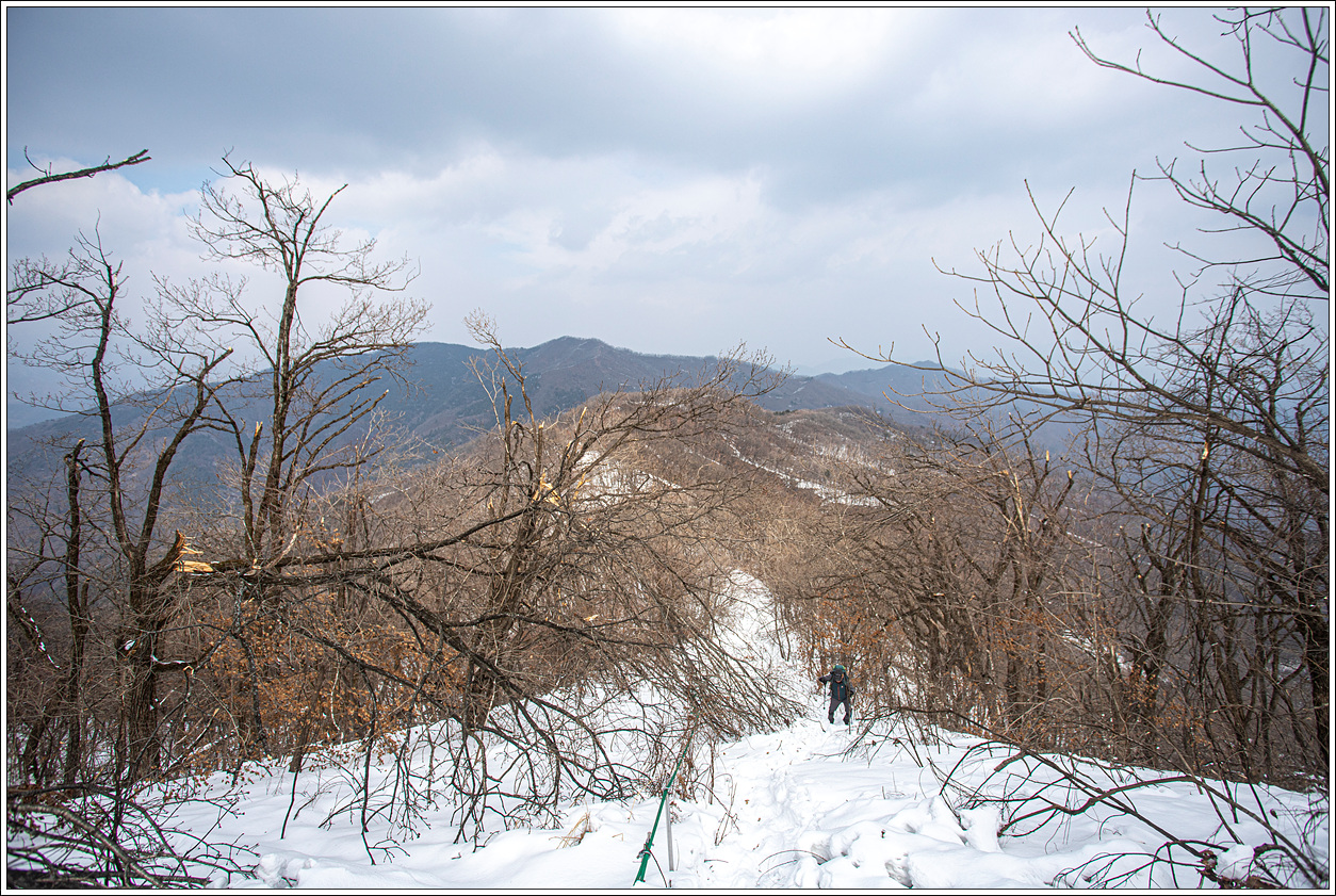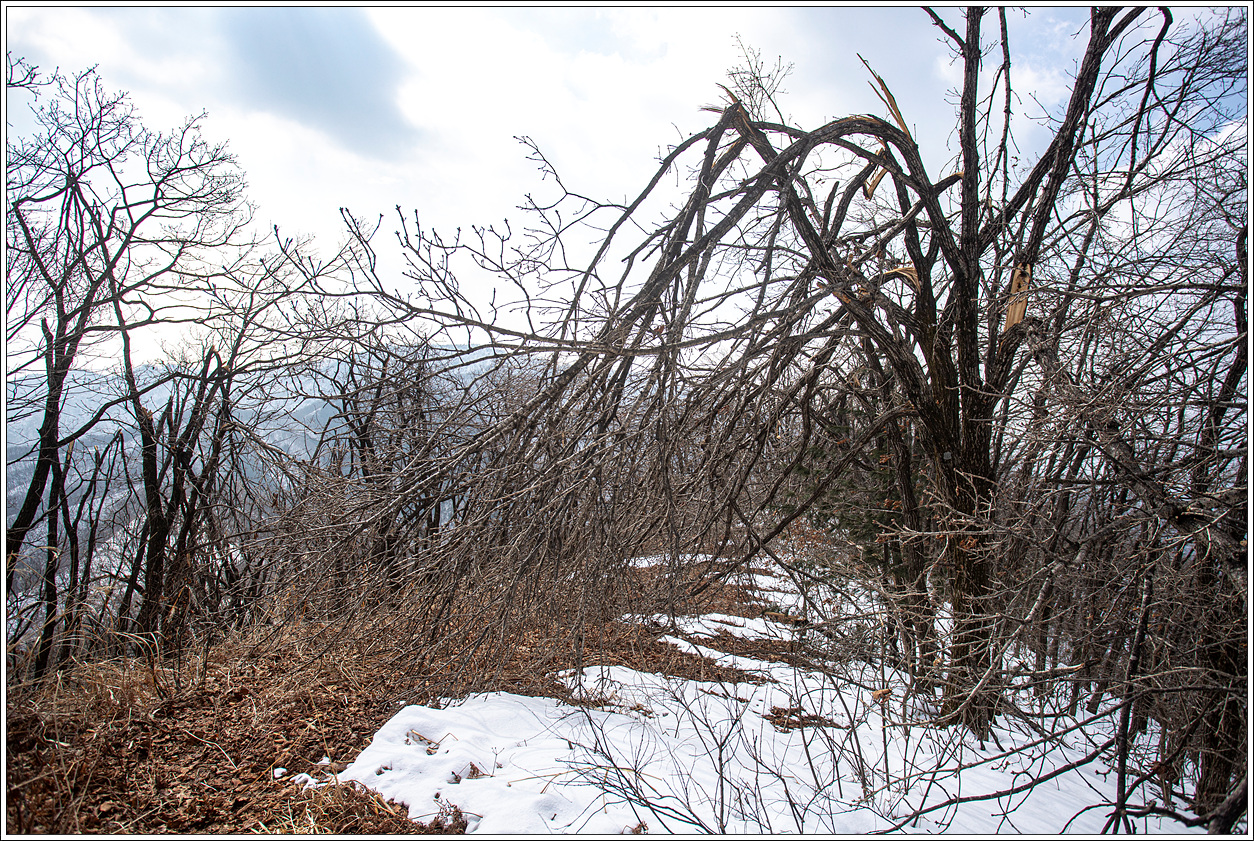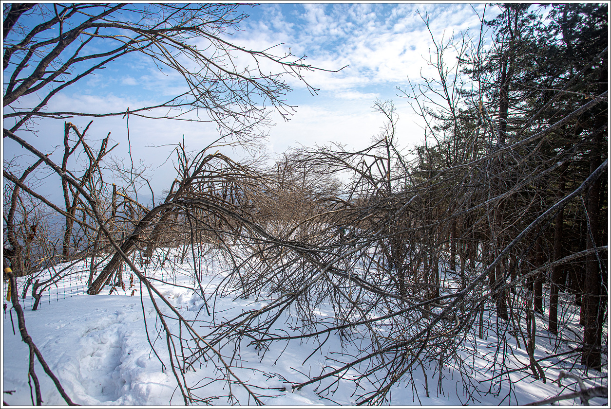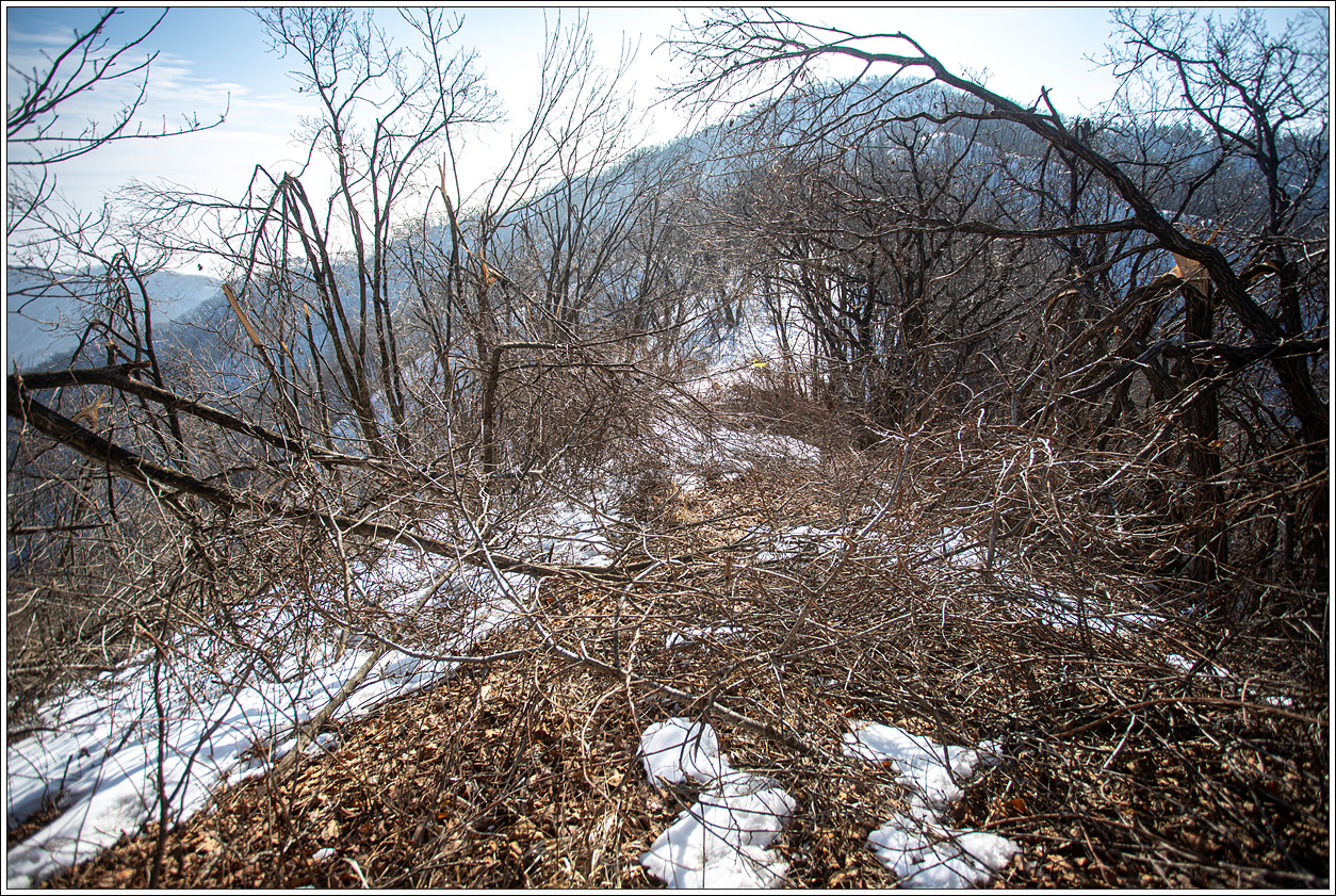 ▽ 나뭇가지가 등로로 쓰러져 엉겨 붙어서 이런 장애물을 통과하려면 정말 왕짜증이 난다. 차라리 눈으로 덮였으면 나을뻔 했다.