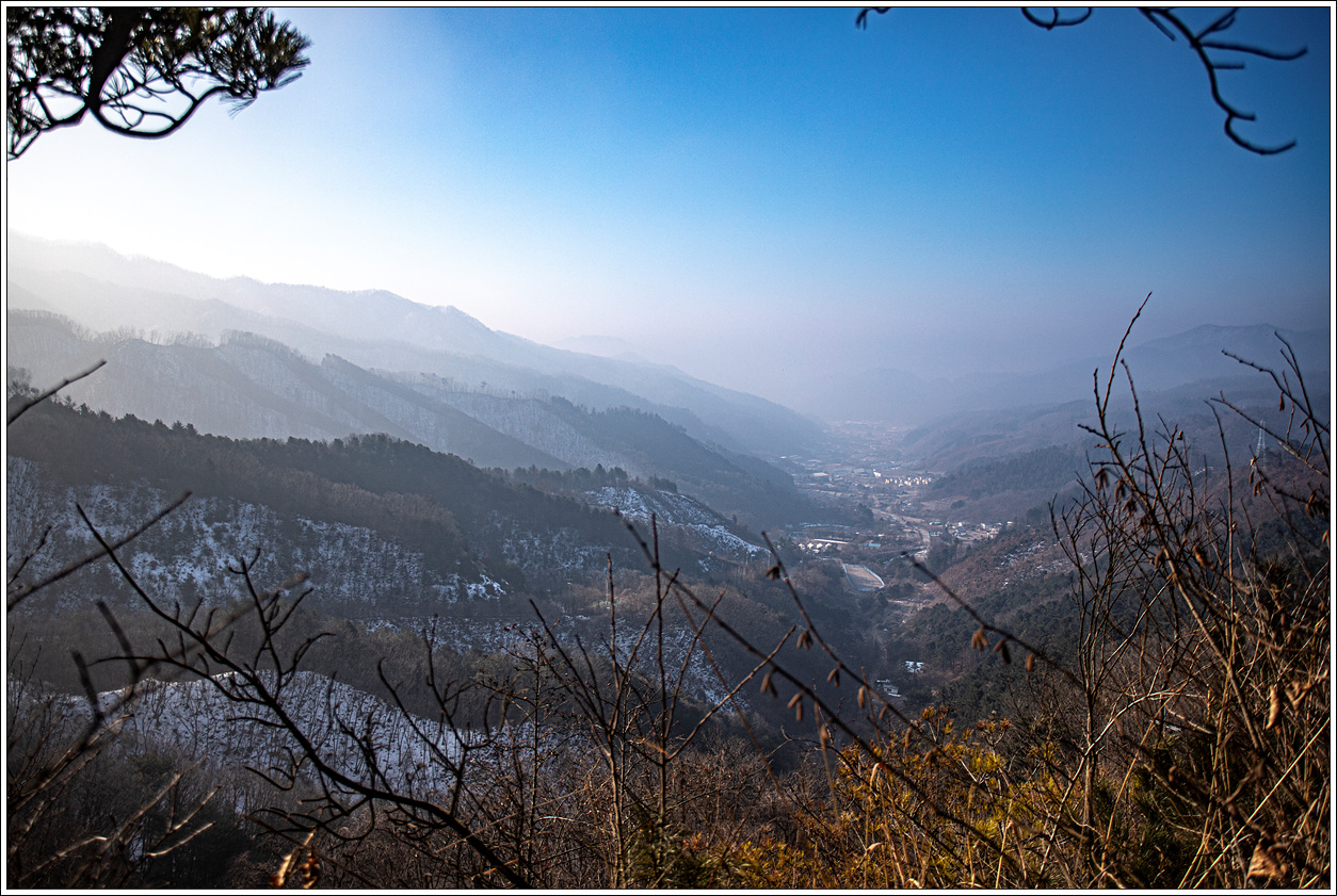 ▽ 능선 상에서 잠시 남쪽 방향의 목동리 쪽을 바라보니 맑은 날씨이긴 하나 미세먼지 나쁨으로 된 기상예보가 틀리지 않아 조망의 기대는 저버려야겠다.