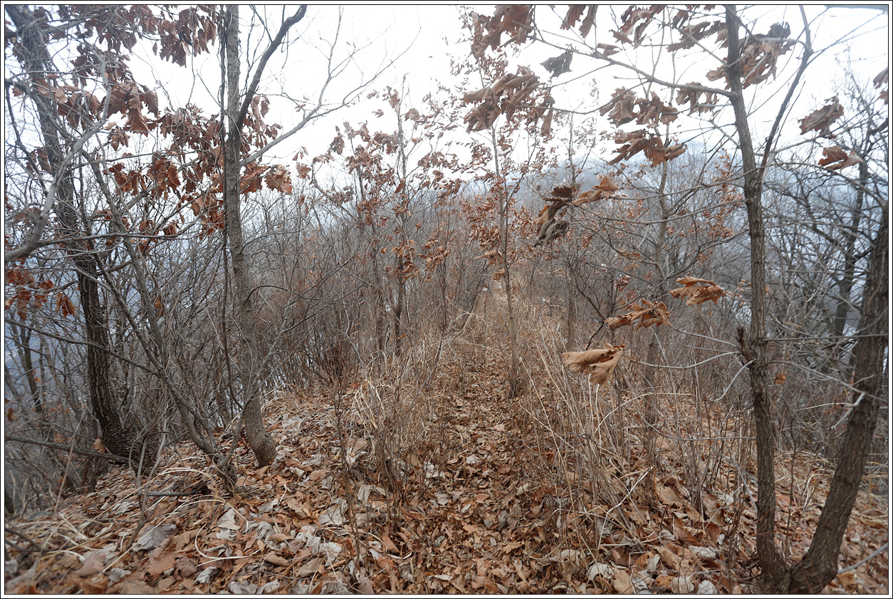 ▽ 능선상에 굵은 참나무종류가 빼곡한 길을 걷게 되기도 하고...