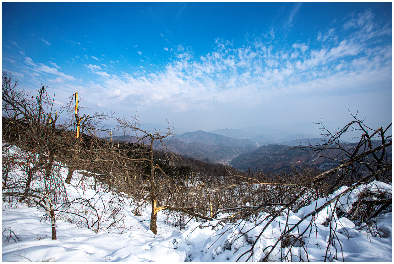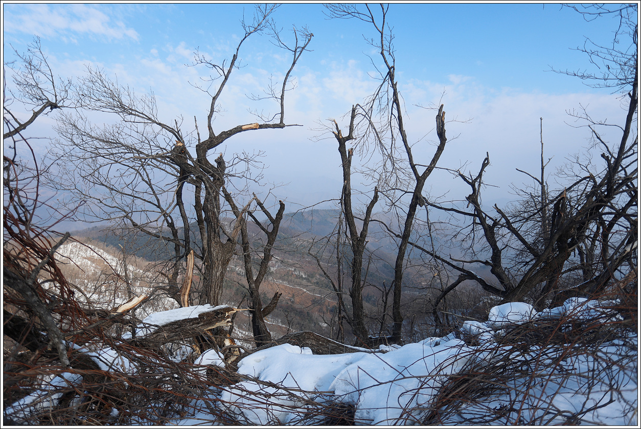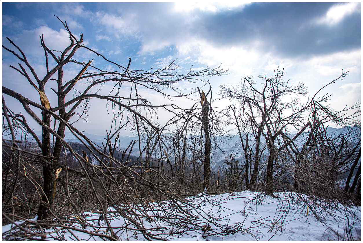 ▽ 뒤돌아 보니 멀리 화악산과 응봉이 설산인 상태로 눈에 들어온다. 원인 모를 나뭇가지가 모두 폭격을 맞은 듯 동강이 난 채로 흉물스럽다.