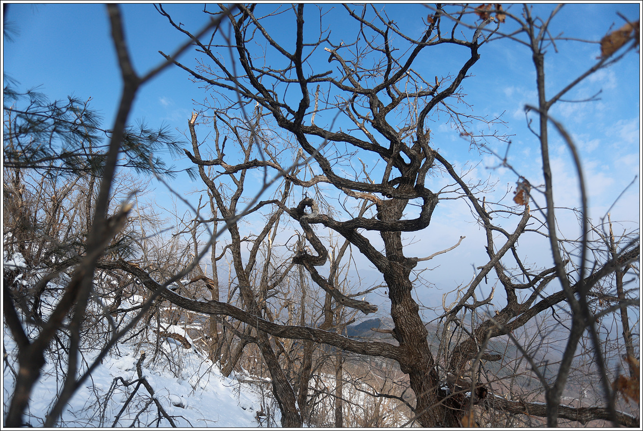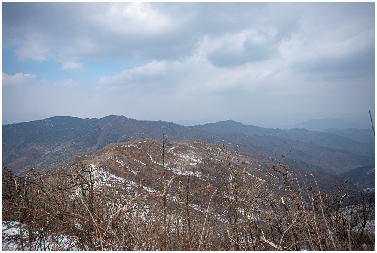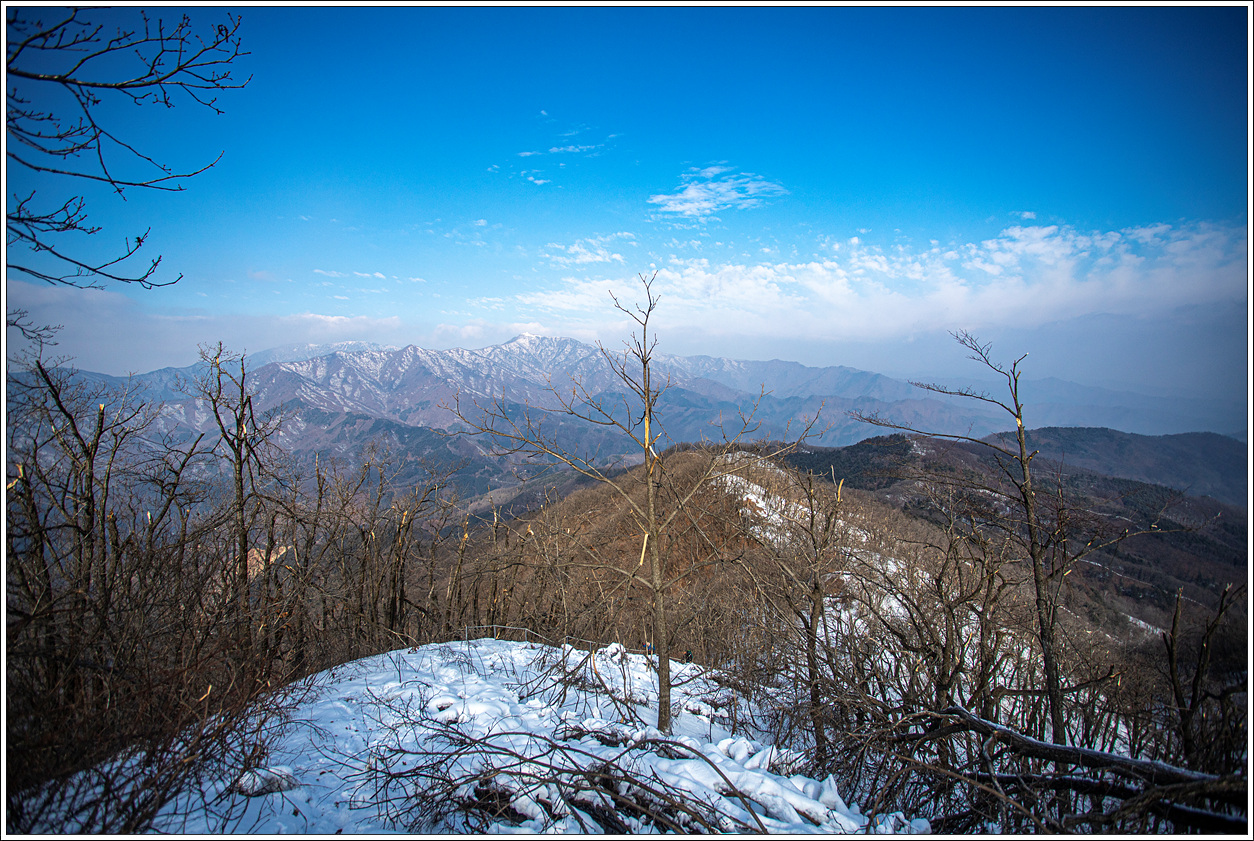 ▽ 뒤돌아 보니 멀리 화악산과 응봉이 설산인 상태로 눈에 들어온다. 원인 모를 나뭇가지가 모두 폭격을 맞은 듯 동강이 난 채로 흉물스럽다.