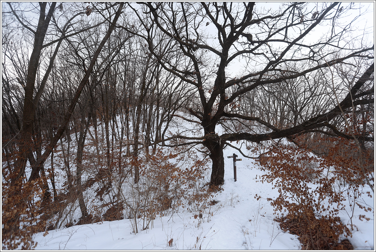▽ 퇴골고개라는 곳에 자연의 시달림에 못이겨 고사목이 된 참나무가 한 그루가 시선에 들어온다.