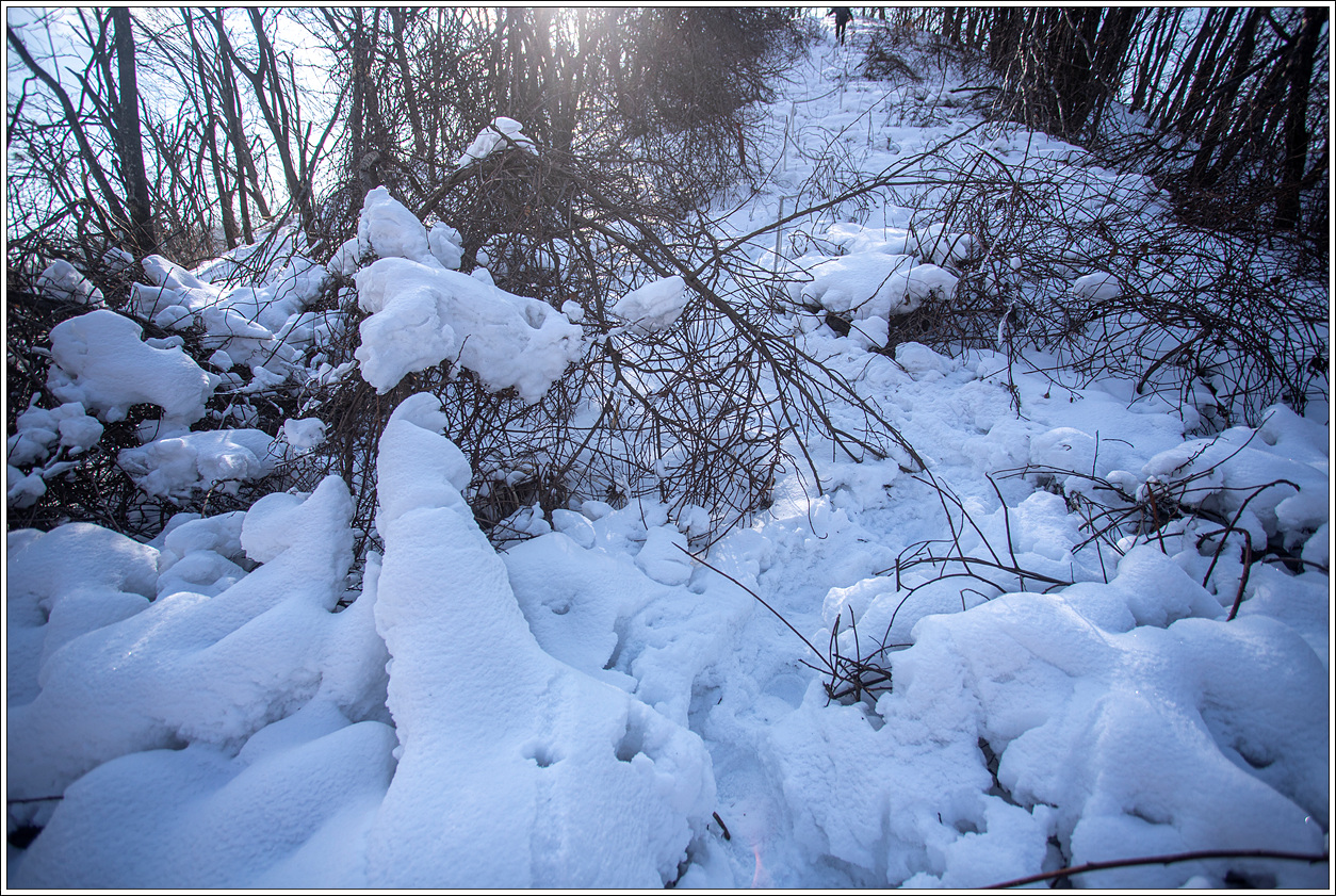 ▽ 러셀이 된 등로도 있고 앞서간 사람의 발자국을 그대로 디뎌야 하는 깊이의 눈길도 있다.