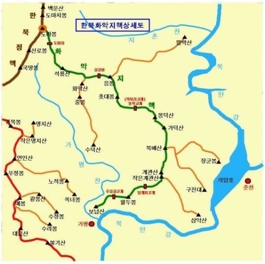 ▽ 한북정맥에서 도마봉에 이르러 보납산까지 이어지는 구간을 화악지맥이라고 하는데 몽가북계가 바로 화악지맥의 한 구간이기도 하다.