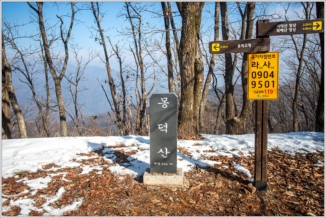 ▽ 홍적고개에서 2.2km지점인 몽덕산(蒙德山) 정상에 도착, 인증하고...