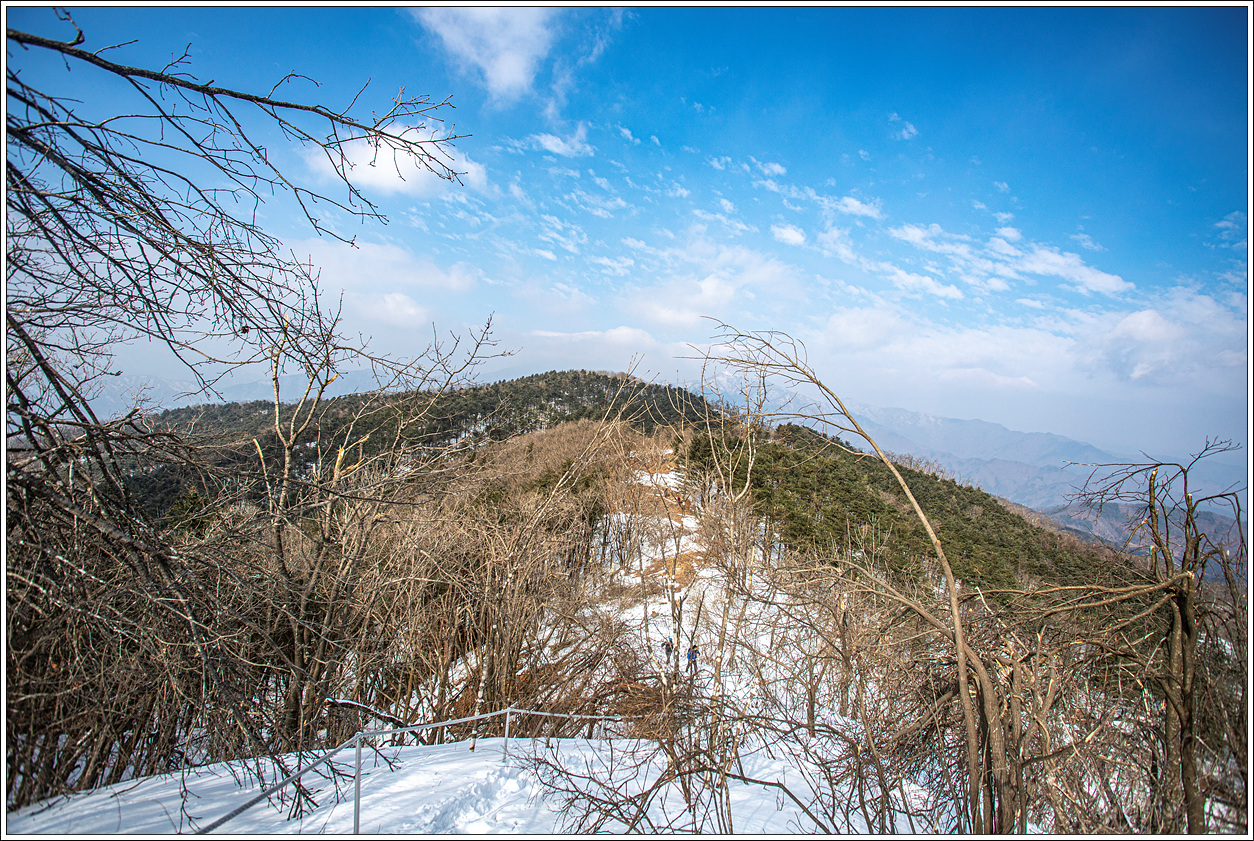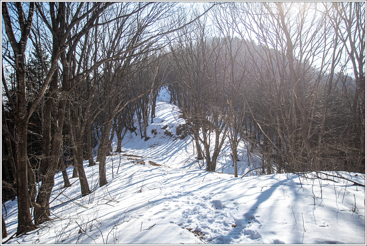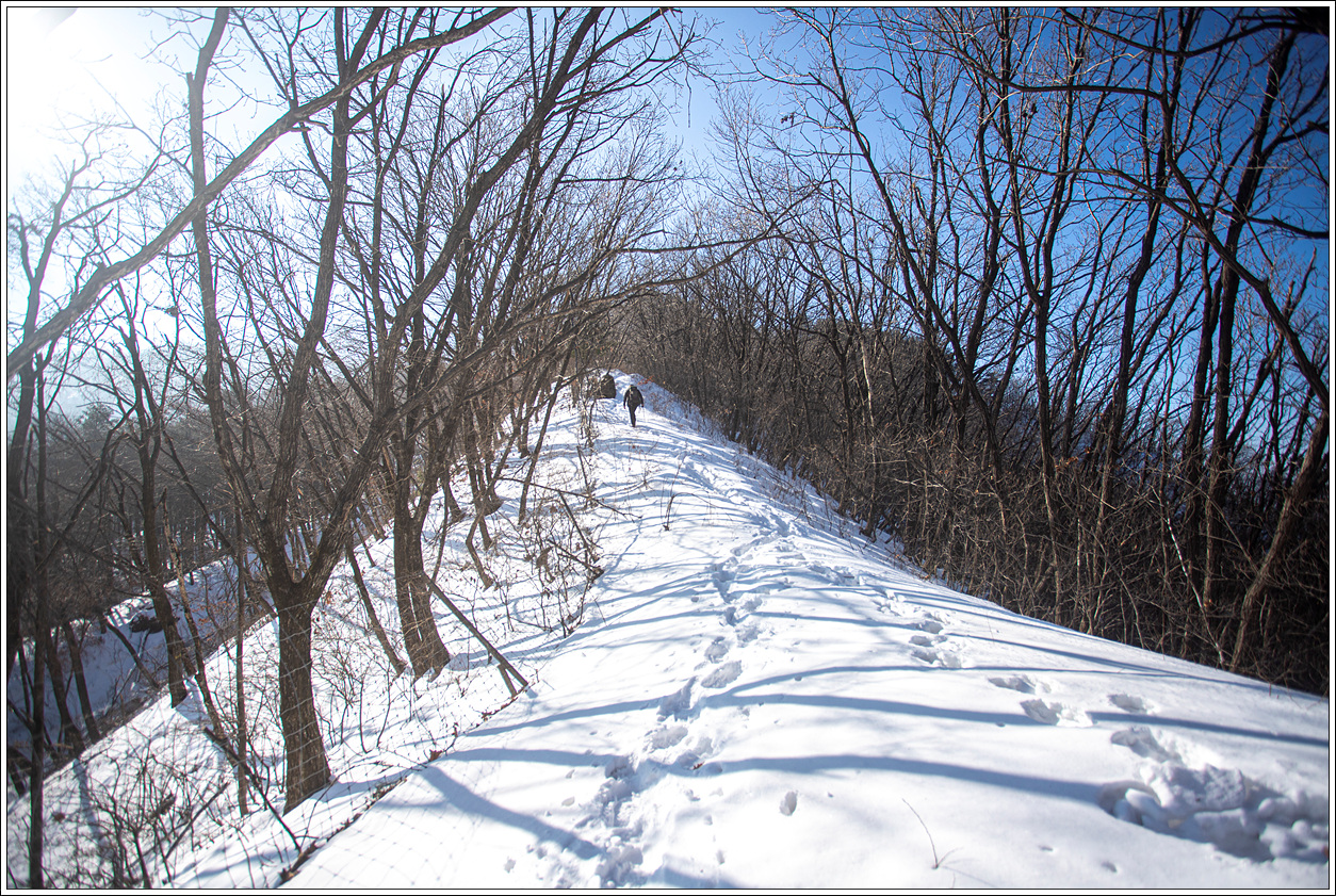▽ 참 오랜만에 눈을 밟아 보는 산행이다. 바위가 없는 육산으로 능선길이 순탄하다.