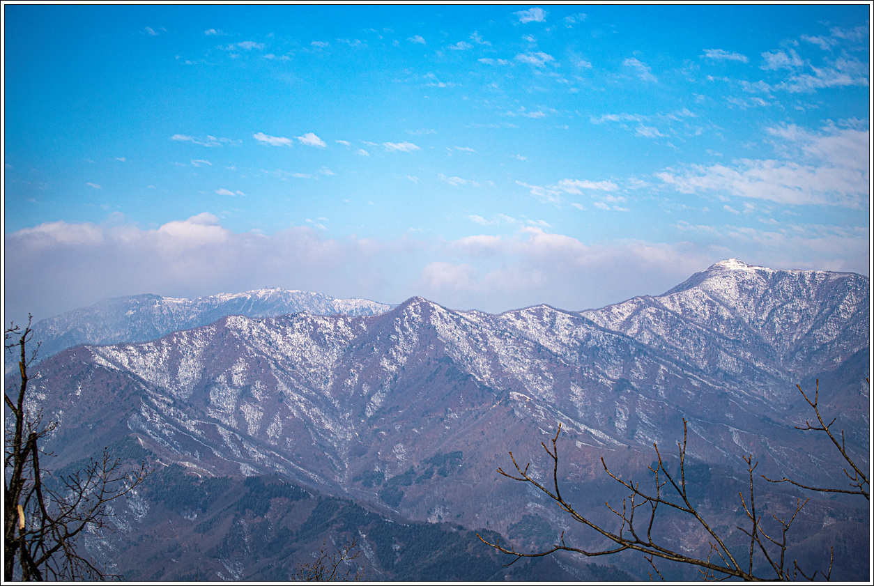 ▽ 가덕산에서 동쪽으로 뻗어 내린 능선과 삿갓봉...오늘 B팀은 삿갓봉으로 진행하여 하산하는 것으로 계획되어 있었으나 등로가 여의치 않을 것 같아 모두 취소하고 A코스로 모두 진행하기로 했다. 왼쪽 멀리 희미하게 용화산이 보인다.