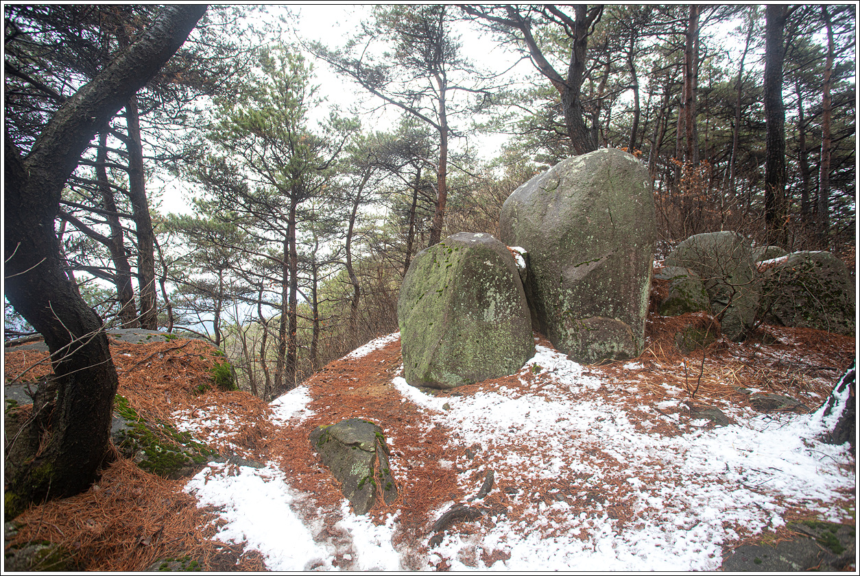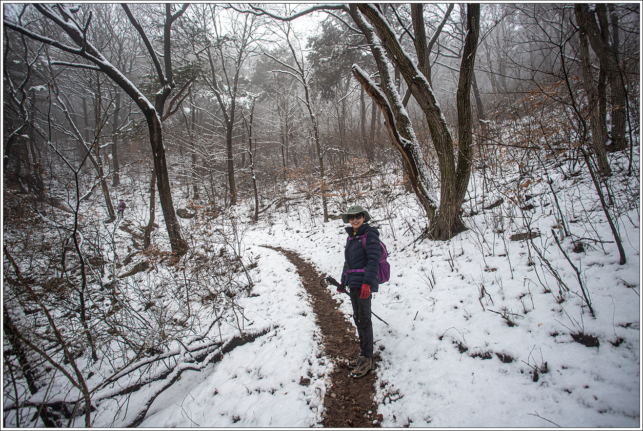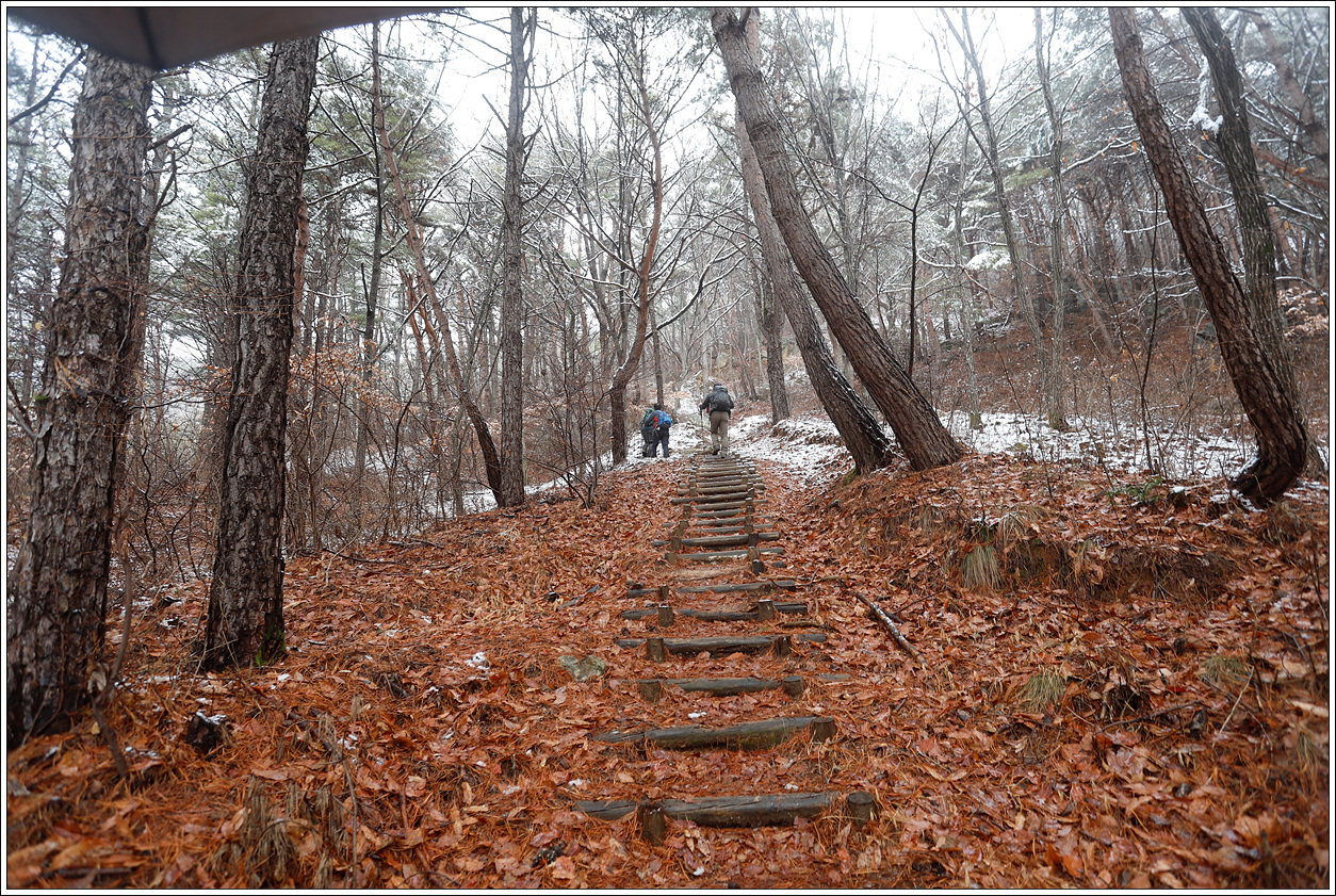 ▽ 아랫 지방은 날씨가 따듯하여 눈이 쌓여 있으리라고는 생각을 못하고 배낭이 늘 휴대하던 아이젠을 오늘 아침 꺼내 놓은 실수로 인하여 미숭산에서 내려 오는 길에 다소 고생을 하며 시간을 지체했다. 이후 부터는 순탄한 등로가 이어져 다행이다.