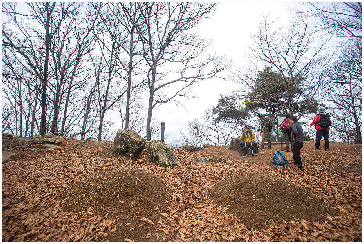 ▽ 정상에는 묘 2기가 풀 한포기 나지 않은 상태로 있고 주변은 테뫼식의 주산성(主山城)의 흔적이 있다.