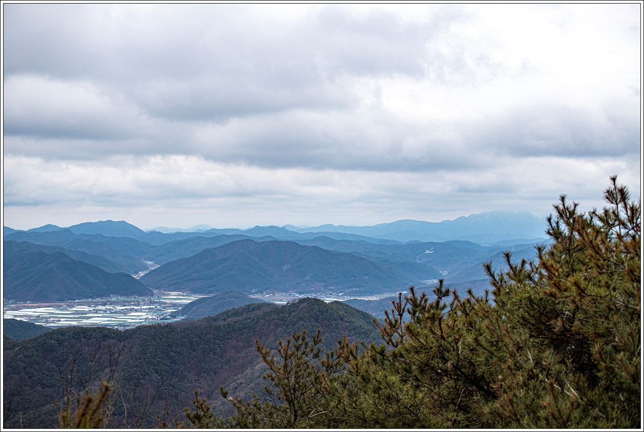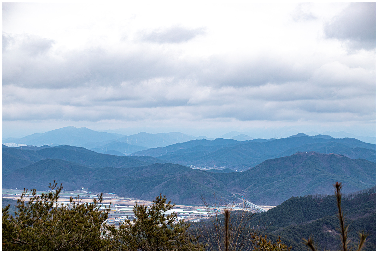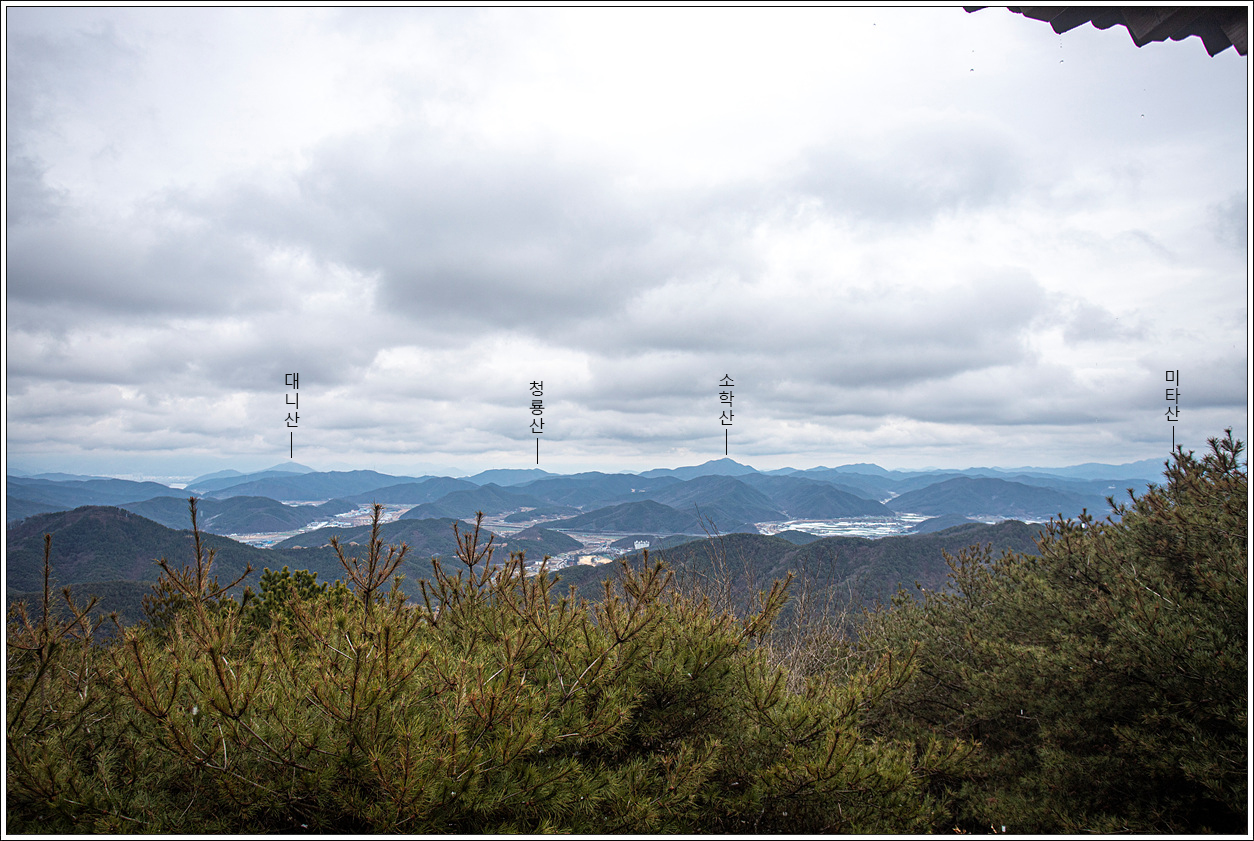 ▽ 왼쪽 멀리 대구 달성군의 금계산과 오른쪽으로 고령군 개진면에 자리한 제석산이 볼록하게 선을 보인다. 그 뒤로 구름에 가려져 안 보이는 비슬산이 자리하고 있겠다.