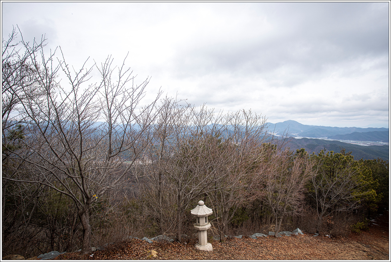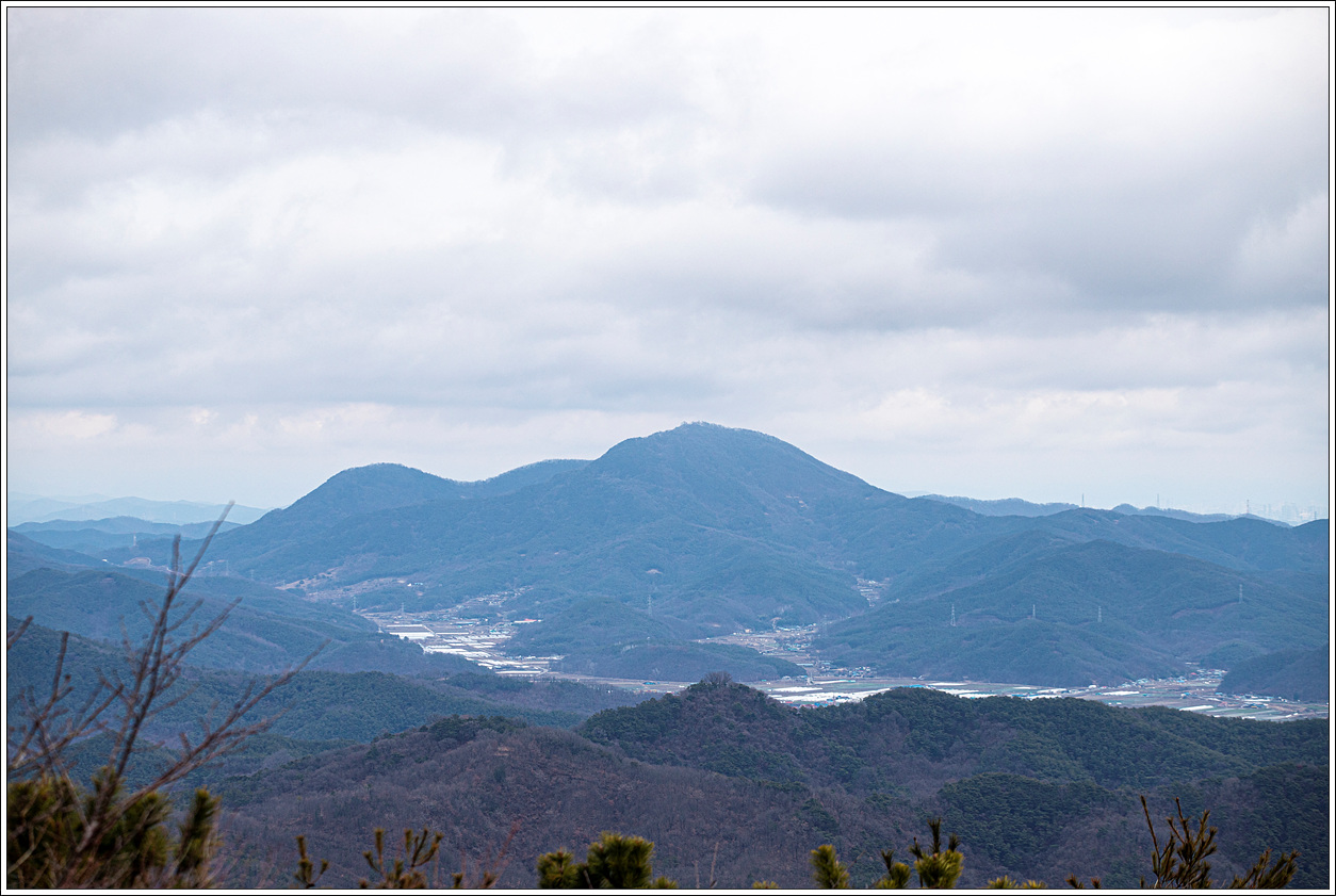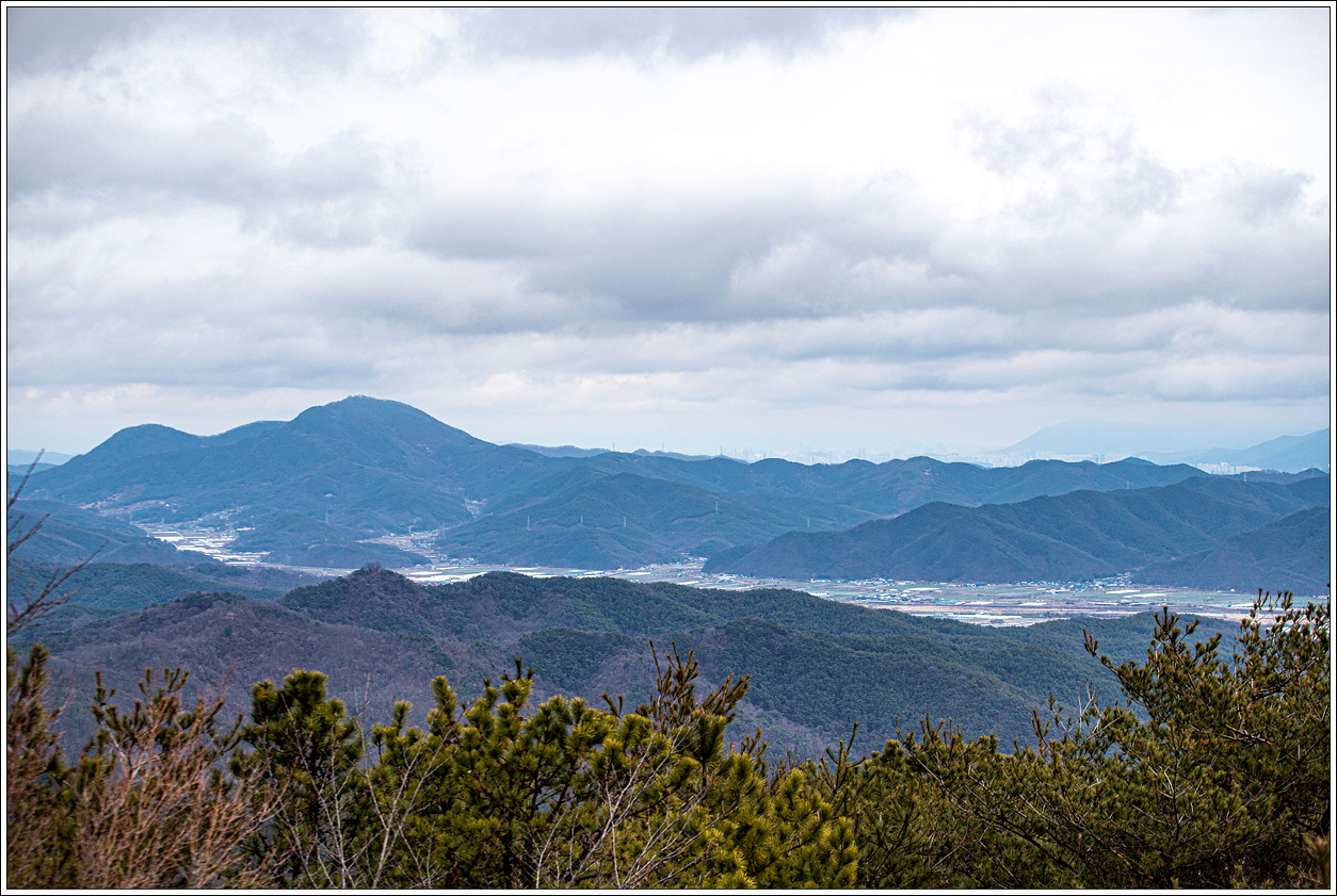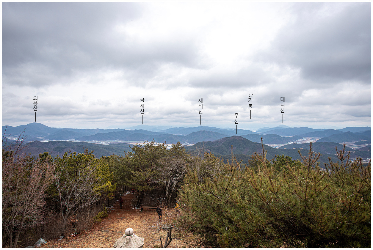 ▽ 왼쪽 멀리 대구 달성군의 금계산과 오른쪽으로 고령군 개진면에 자리한 제석산이 볼록하게 선을 보인다. 그 뒤로 구름에 가려져 안 보이는 비슬산이 자리하고 있겠다.