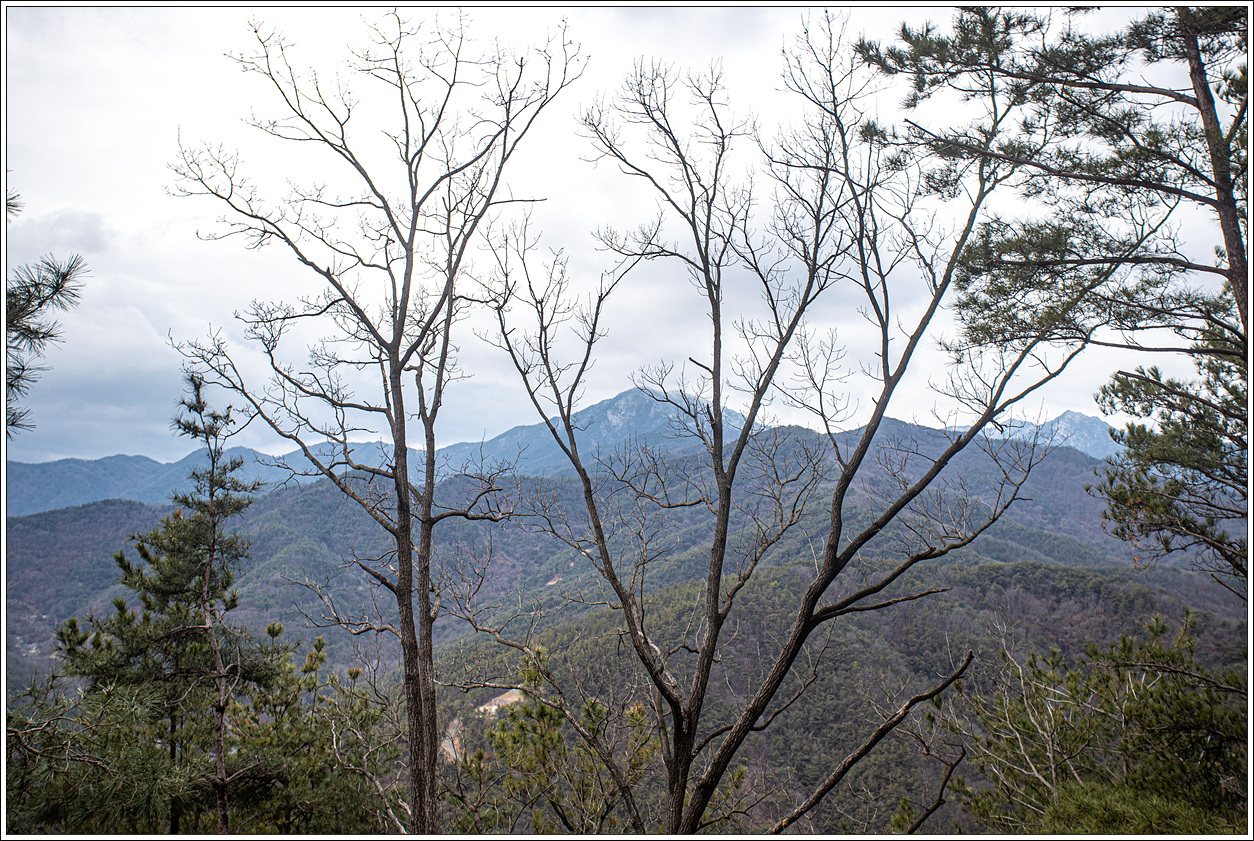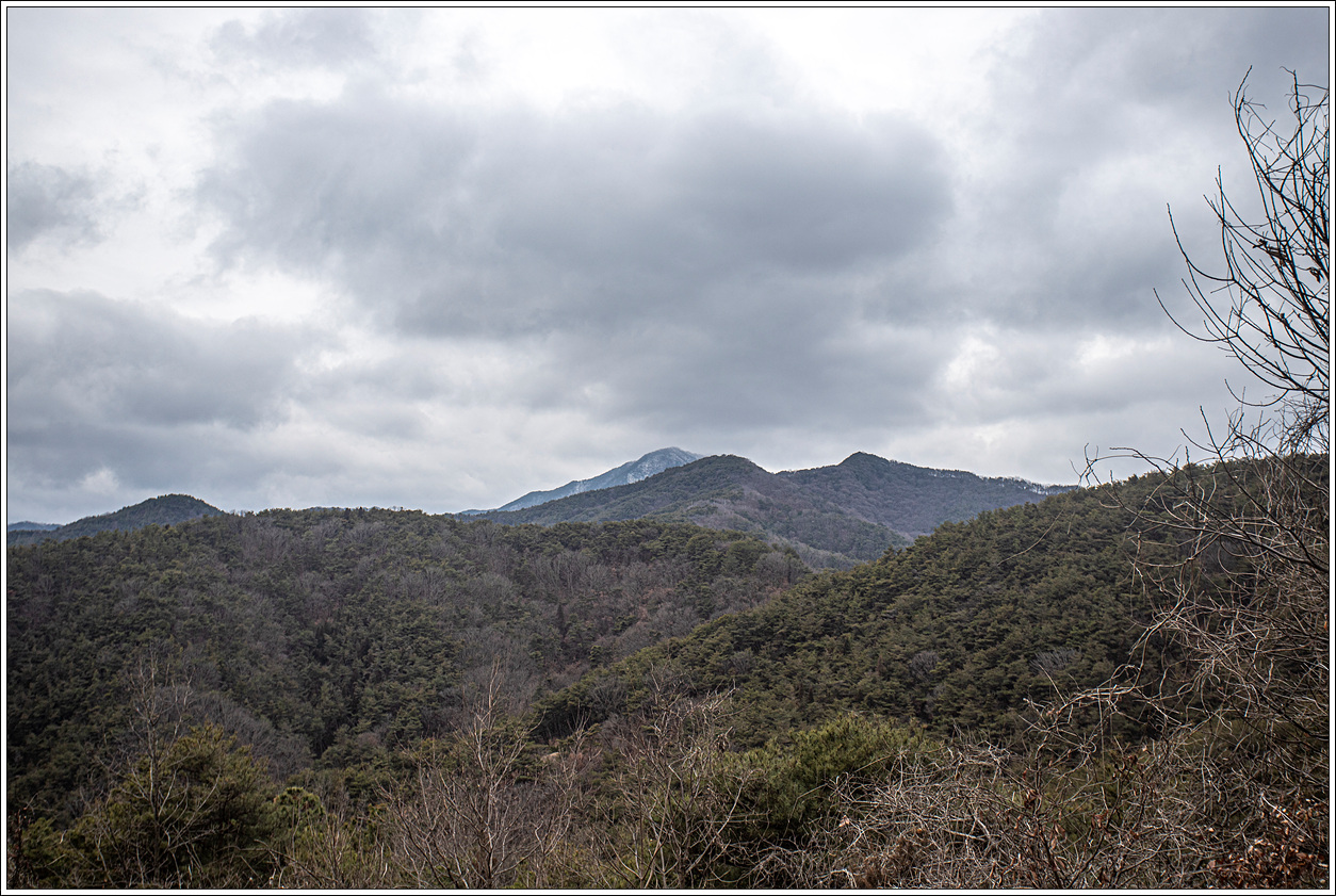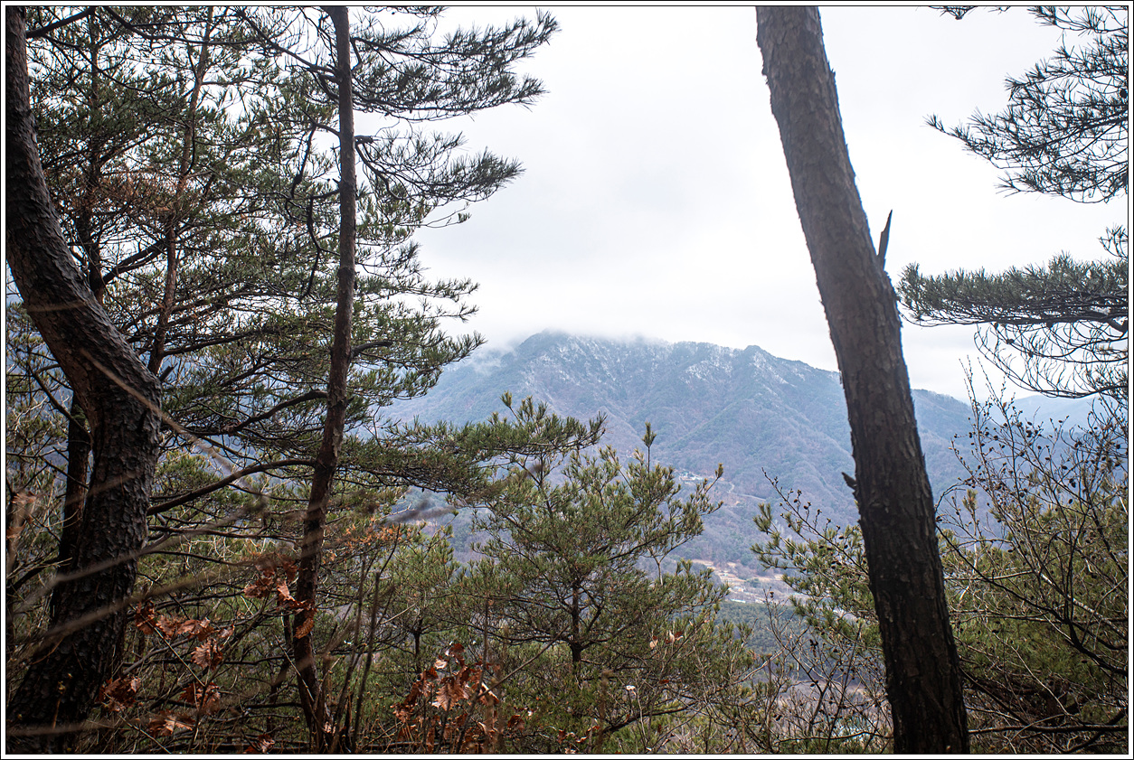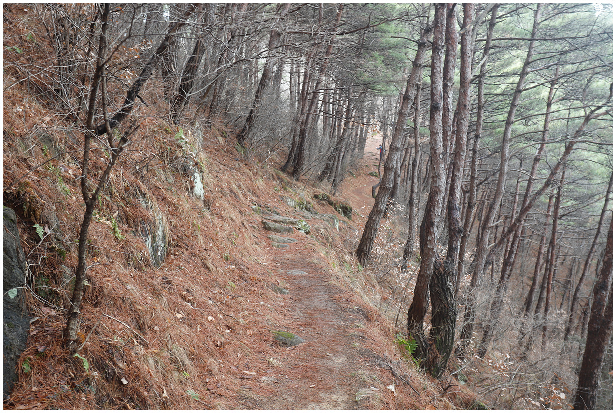 ▽ 조망을 전혀 할 수 없다가 어느 정도 하산을 하면서 나뭇가지 사이로 안개에 가려진 산을 보게 되는데 아마도 미숭산 북쪽으로 뻗어 있는 문수봉(677m)로 보인다.