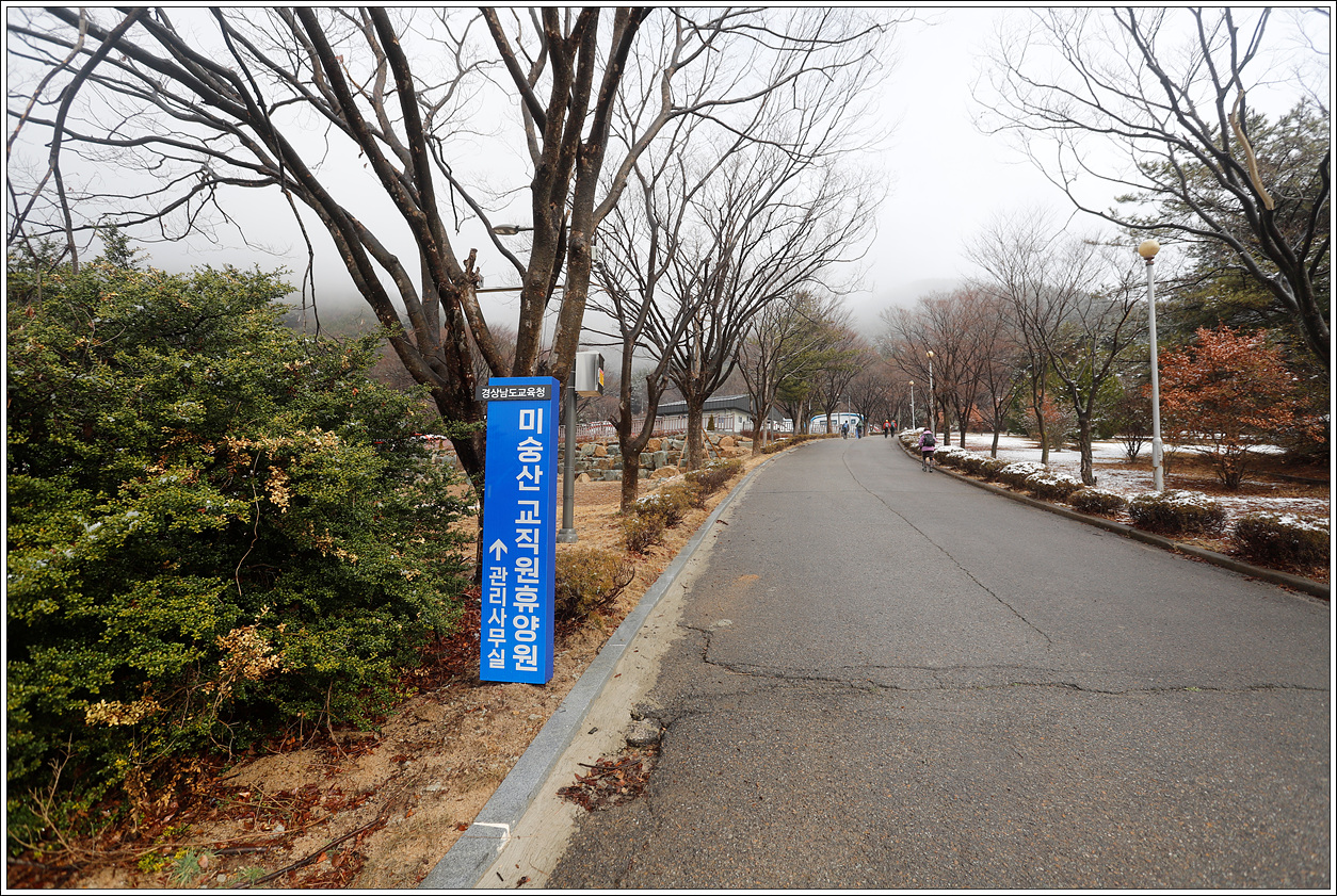 ▽ 전날 눈이 내렸는지 땅은 축축하고 주변 나무는 눈이 녹아 금방 비가 내린 듯 우중충한 분위기다. 경남교육청의 미숭산 교직원휴양원을 지나고...