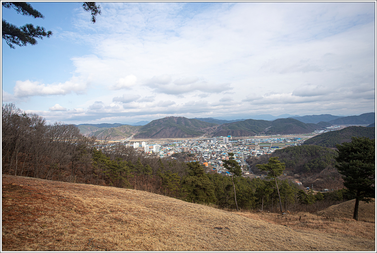 ▽ 바로 앞에 진행할 주산이 보이고 멀리는 구름에 가려서 안보이는 비슬산 라인의 관기봉이 자리하고 있겠다.
