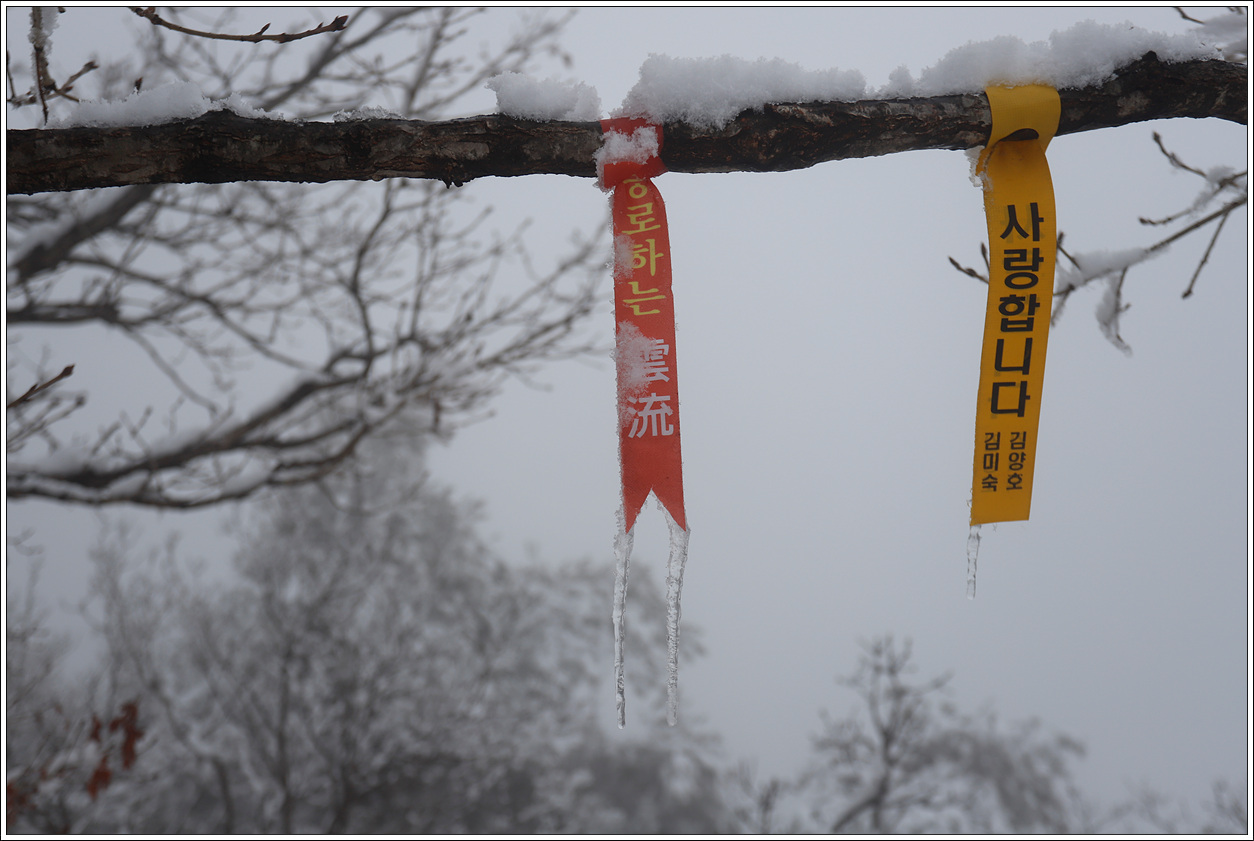 ▽ 다녀간 산악회 리본 꼬리에도 고드름이 마치 연 꼬리와 같이 길게 달렸다.
