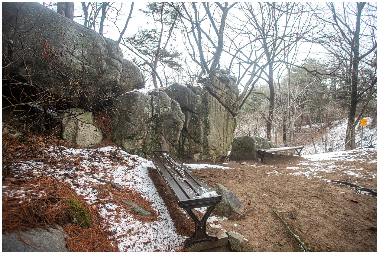 ▽ 반룡사로 내려가는 갈림길에 도착했다. 곳곳에 의자가 놓여 있는 쉼터가 있어 등산객에 대한 지자체의 배려가 돋보인다.