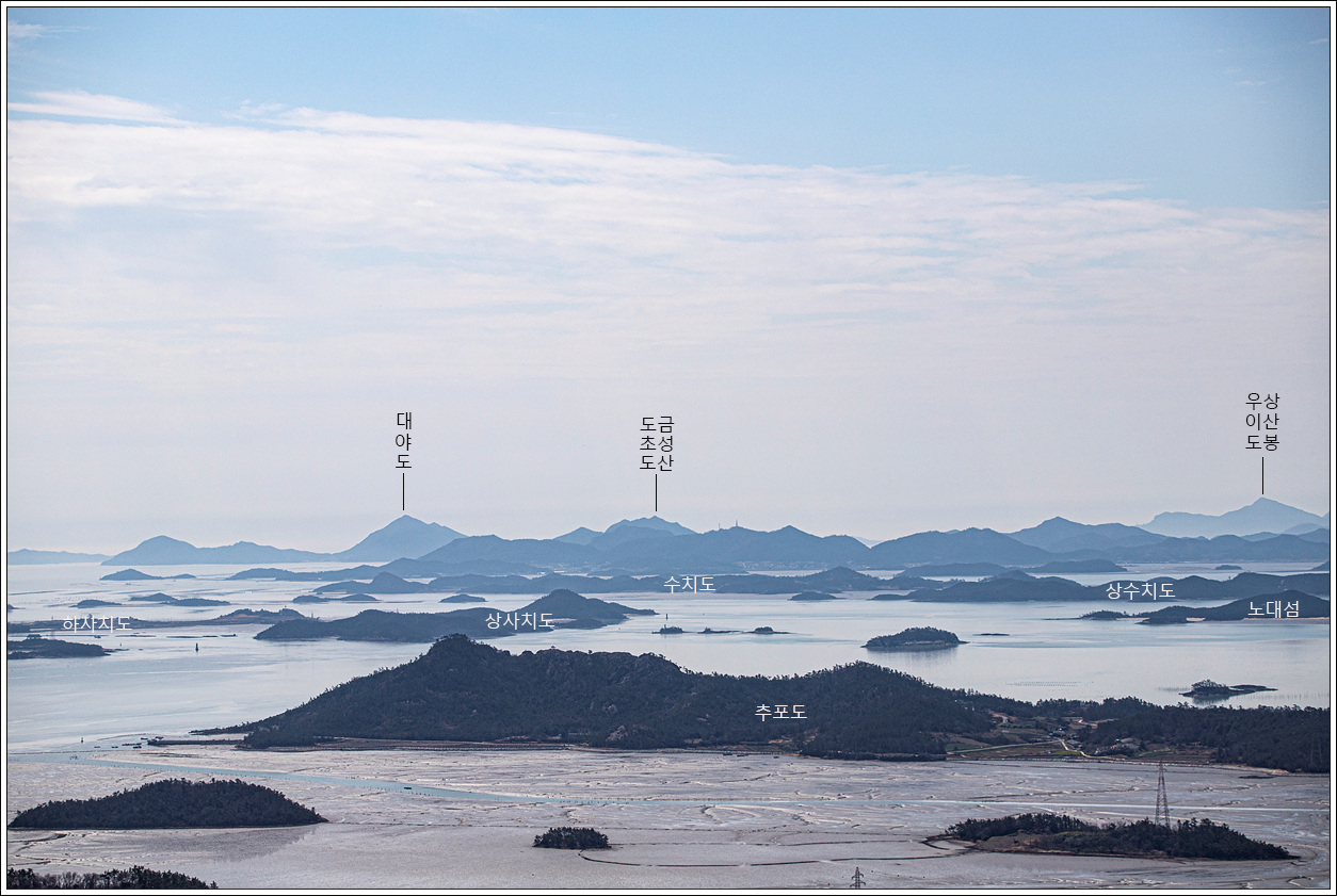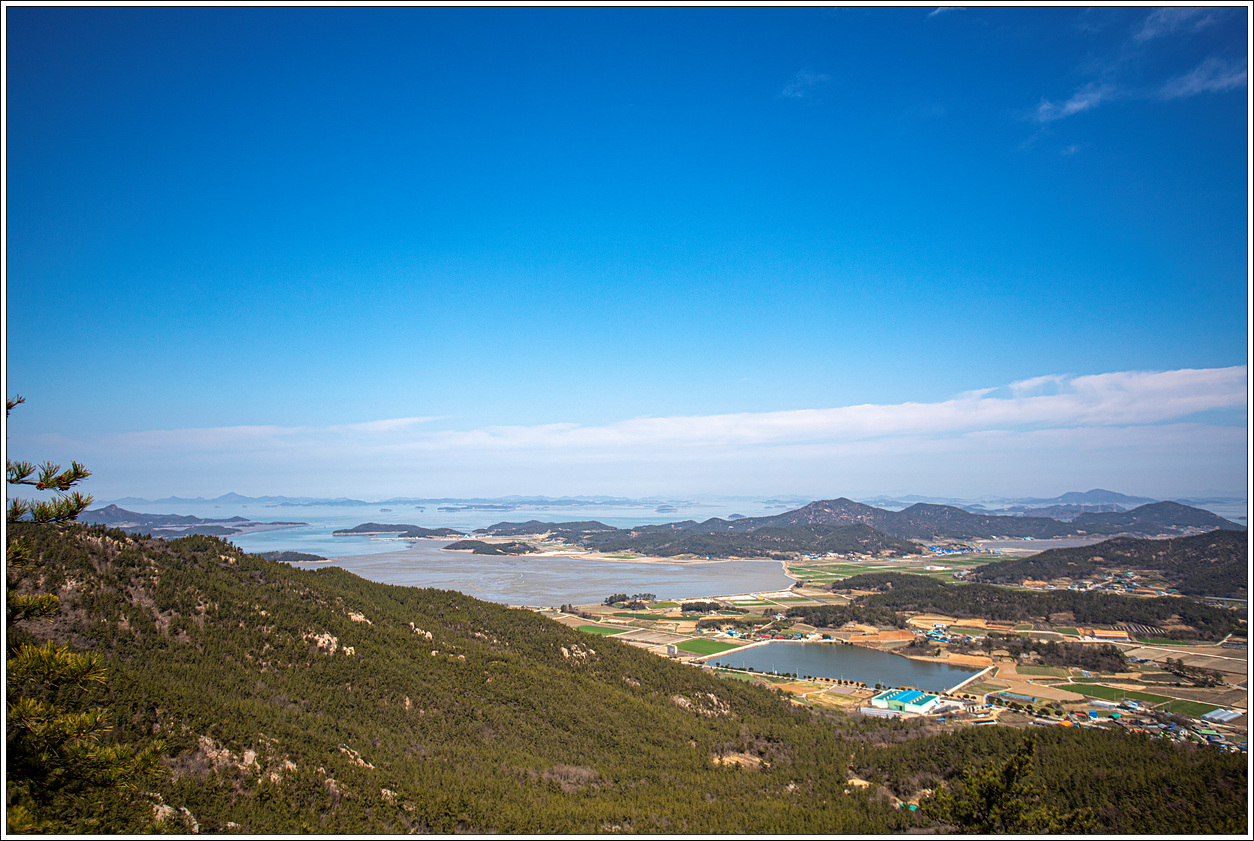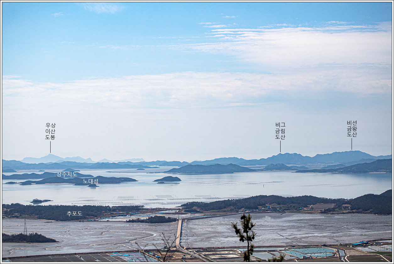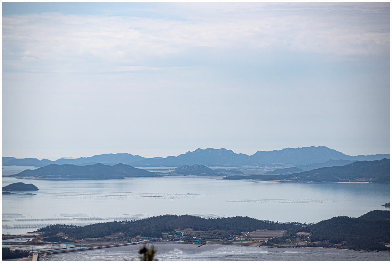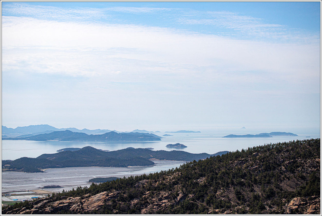 ▽ 첫 조망터에서 전망을 보니 날씨가 받쳐주는 풍경이 그림 같다. 전에 왔을 때와 썰물 상태가 비슷한데 그 당시는 미세먼지로 조망이 별로였으나 오늘은 최고의 조망이다.