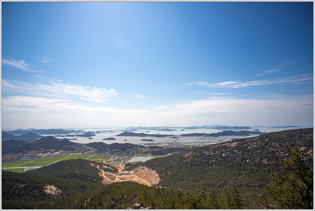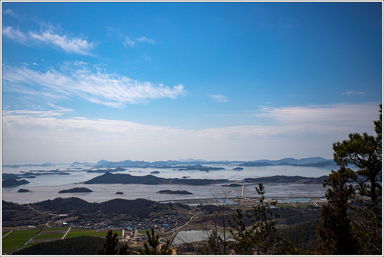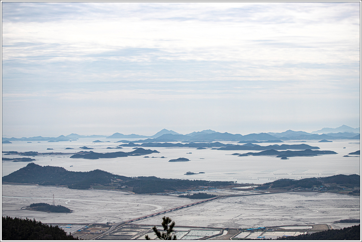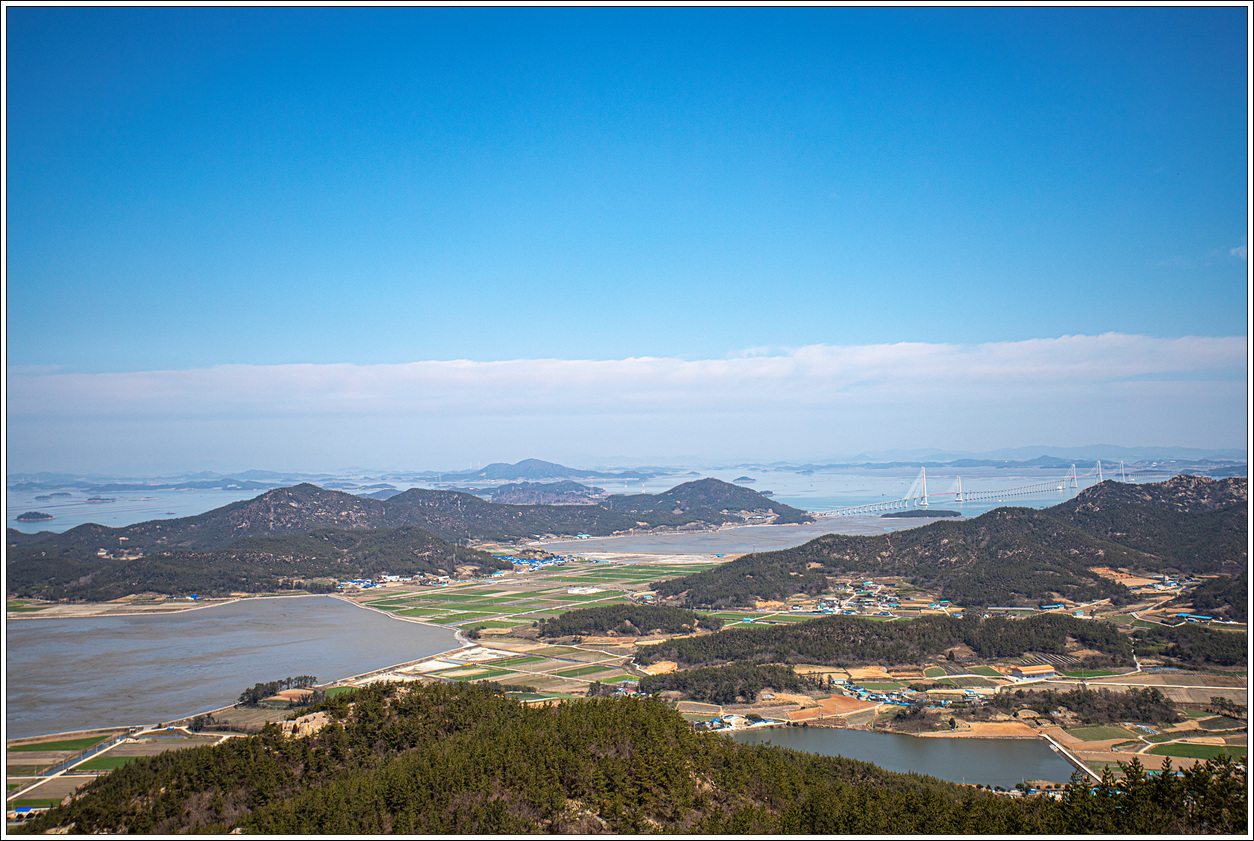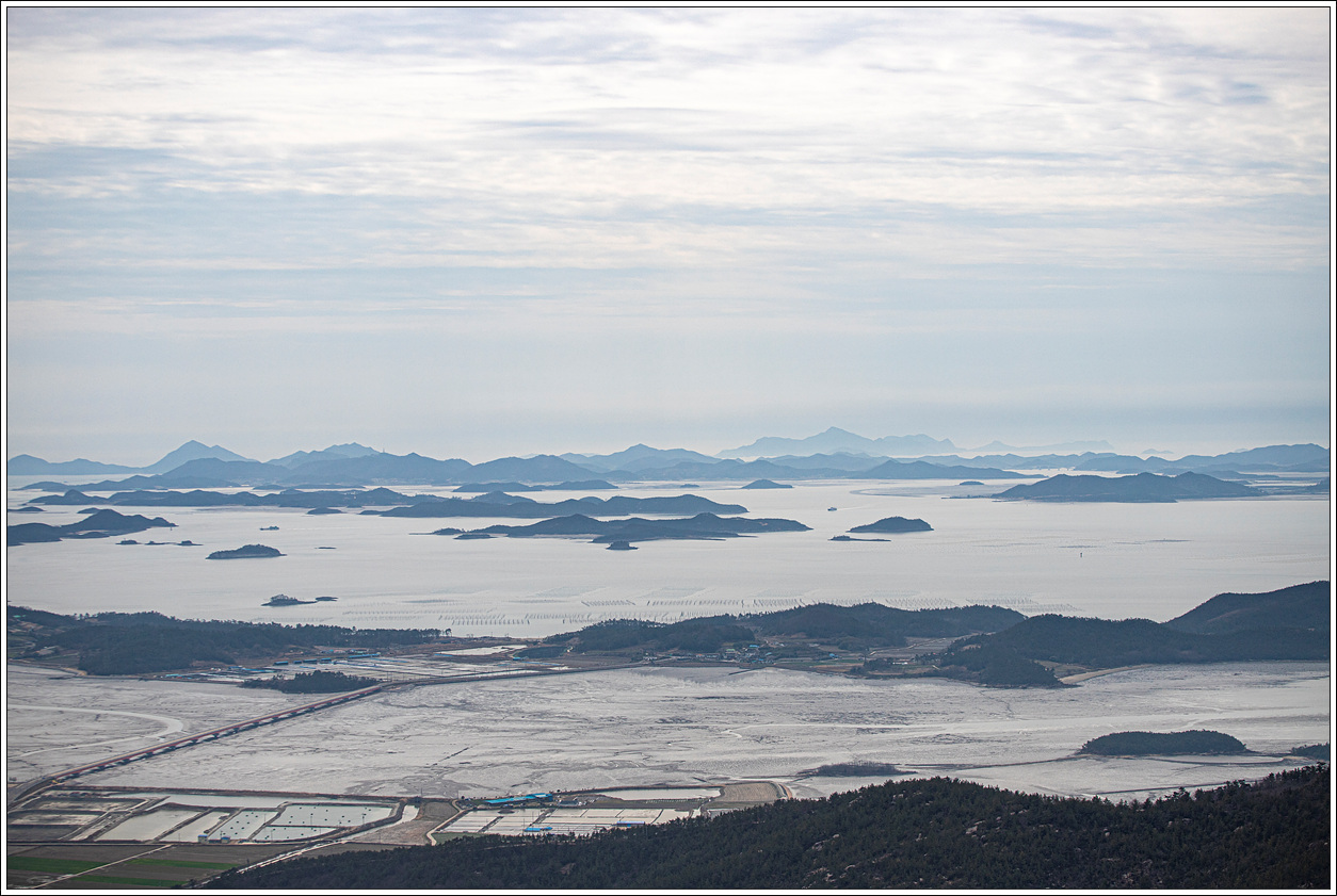 ▽ 첫 조망터에서 전망을 보니 날씨가 받쳐주는 풍경이 그림 같다. 전에 왔을 때와 썰물 상태가 비슷한데 그 당시는 미세먼지로 조망이 별로였으나 오늘은 최고의 조망이다.