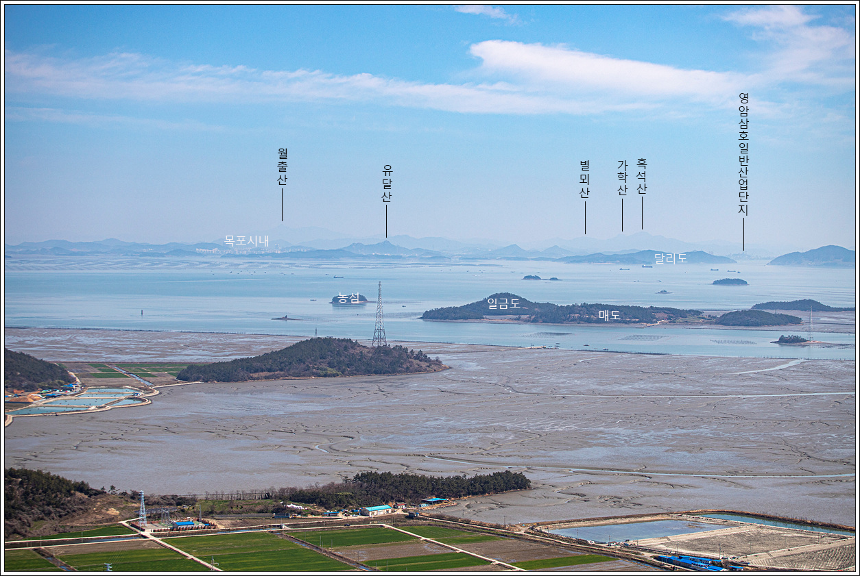 ▽ 동쪽 방향으로 앞에 박달산이 자리하고 왼쪽 멀리 매화도와 가운데 송공산, 오늘쪽 멀리는 자그맣게 목포의 유달산, 그 뒤로 희미하나마 영암의 월출산이 보인다.