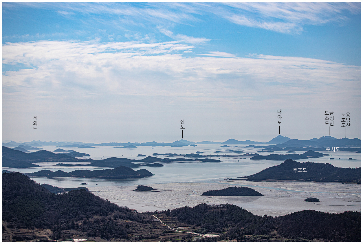 ▽ 당겨 보니 두 번이나 갔었던 박지도, 반월도도 보이고 상태도 및 하의도까지 조망되는 풍경이다.