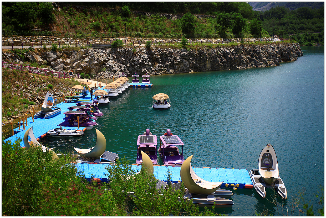 ▽ 수상레져 선착장이다. 보트대여 가격은 모두 40,000원으로 모형은 알콩(파티보트)로 아래에서 방금 출발하는 둥근형태의 보트이고 달콩(문보트)는 초생달과 같이 생긴 보트, 라벤덕(오리배)는 보라색을 띤 배이다.