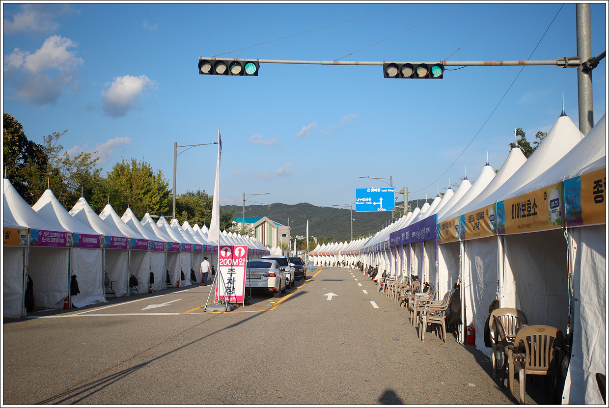 ▽ 주차장 위쪽 시내버스가 다니는 도로를 먹거리 및 각종 홍보를 위한 텐트로 수백 미터를 쳐 놓은 상태다.