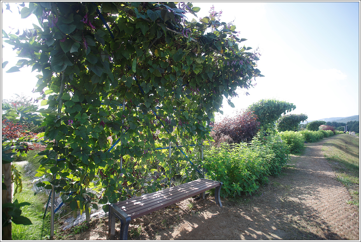 ▽ 편두 덩굴을 이용하여 그늘지게 한 5곳 벤치 중에 앉아 잠시 휴게를 하는데 너무 시원하고 좋다. 인공 구조물이 아닌 곡식의 식물을 이용했다는 아이디어가 좋다.